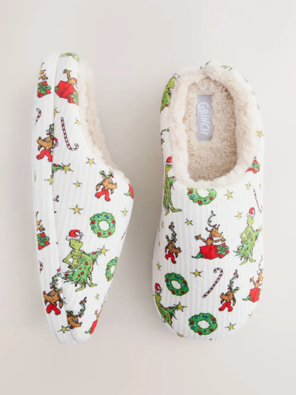 Slide into festive comfort with these cosy mule slippers, perfect for relaxing at home during Christmas. Featuring a playful all-over Grinch pattern and a soft, warm faux fur lining, these slippers complete your comfortable look. They are part of the matching family collection. Mule slippers All over Grinch pattern Faux fur lined Available in matching pyjamas Christmas Matching Family Upper – Textile, Lining & Sock – Textile, Sole – Textile, Other Materials.