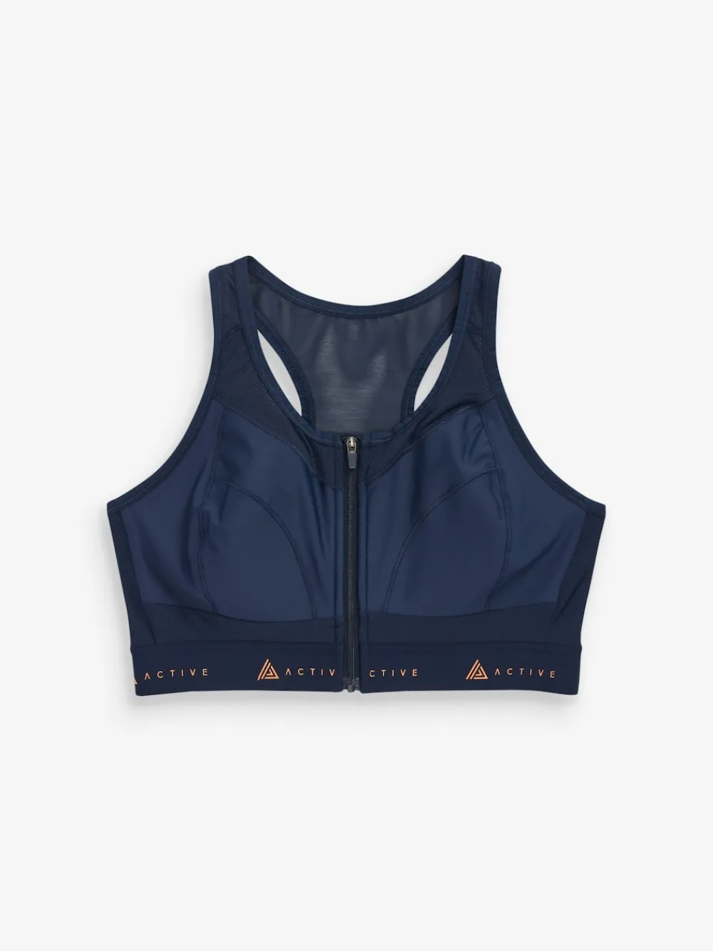 Next DD+ Active Sports Zip Front Dry Tech High Impact Bra Navy Blue New