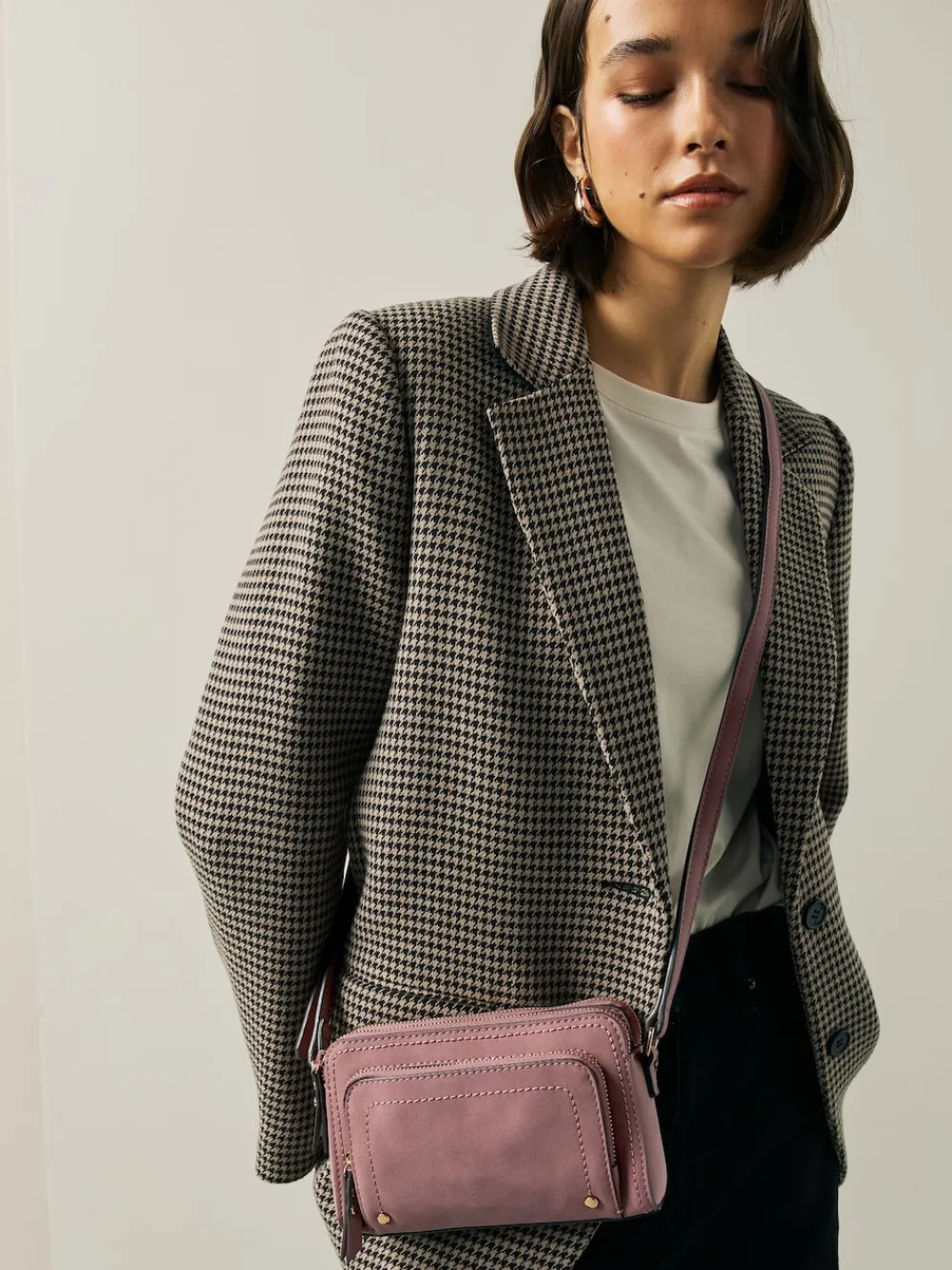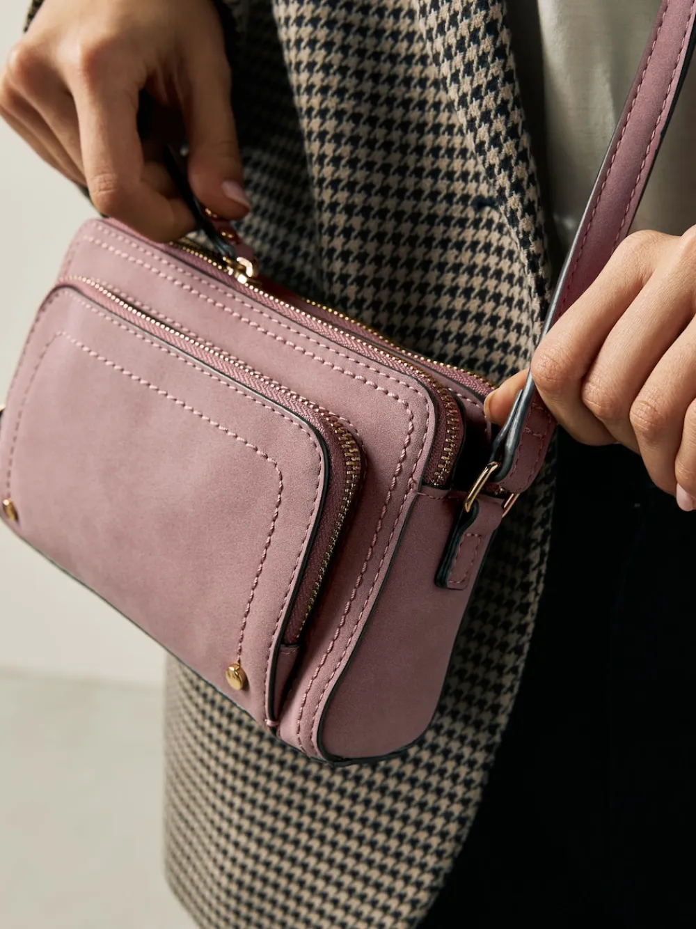 This practical pink cross-body bag is perfect for organising your essentials on the go. Crafted from a soft faux suede material, it features a functional double zip design with two main compartments. The adjustable cross-body strap offers comfortable, hands-free wear, ideal for effortless daytime casual style. Double zip design Cross-body adjustable strap Faux suede material Multiple compartments Height 12.5cm Width 20cm Depth 5.5cm Main 100% PU. Lining 100% Recycled polyester.