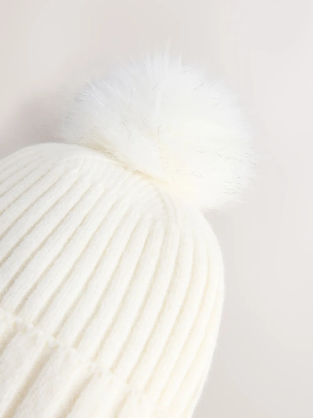 Stay snug and stylish in our rib knit pom pom hat. Rib knit Faux fur pom pom Cosy Main 45% Acrylic, 29% Recycled polyester, 26% Nylon. Trim 73% Acrylic, 15% Polyester, 12% Modacrylic.