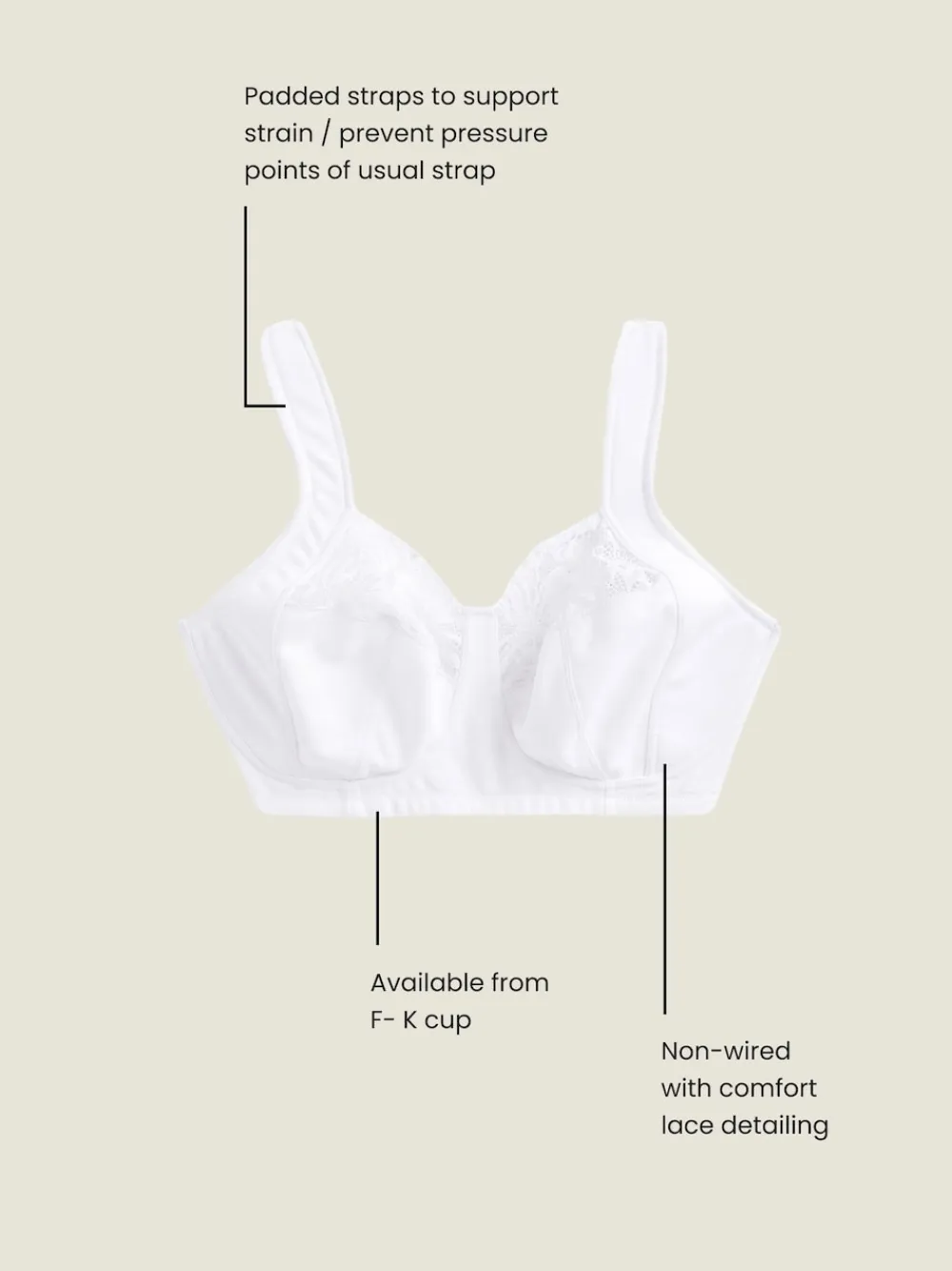 Designed for a fuller bust, our ultimate support F-K cup white bra is a lingerie drawer must-have. Featuring padded adjustable straps, this non-pad and non-wired bra is made to provide a comfortable and supportive fit all day long. Finished with decorative lace detailing and side support for great uplift and forward projection, this bra is not only incredibly comfortable but looks great too. F-K cup Padded straps Non-wired Lace detail Side support Machine washable. 90% Polyester, 9% Nylon, 1% Elastane. CoppaFeel! are the UK’s only youth focused breast cancer awareness charity on a mission to get every young person checking their chest. Next are proud to support their bra hijack campaign.
