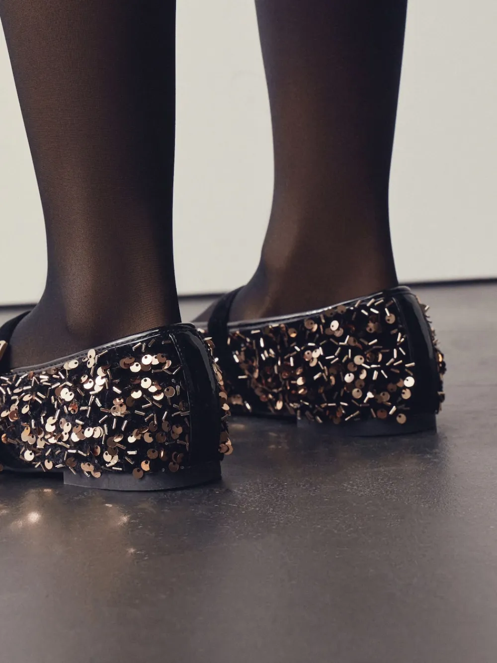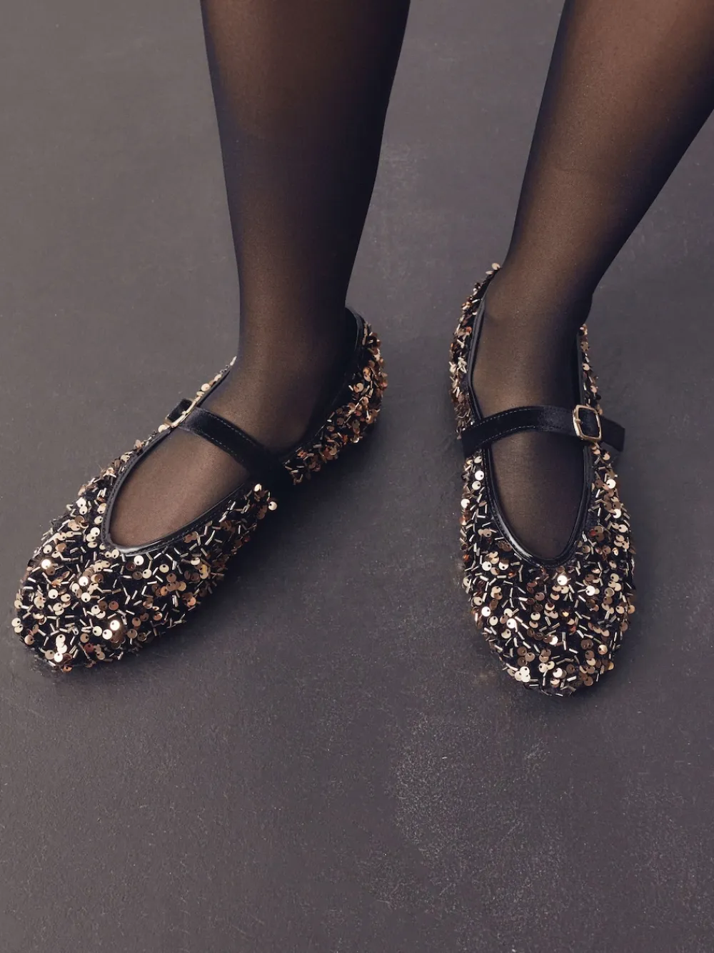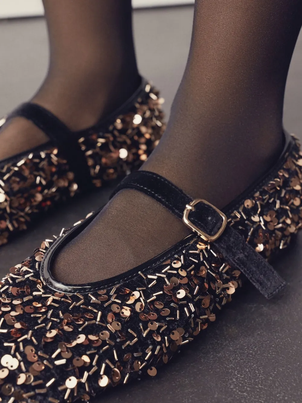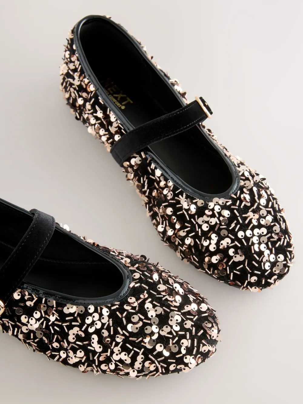 Shine at any event in these dazzling Mary Jane flats. The black and gold sequin upper with a velvet trim adds ultimate glitz, perfect for occasionwear. Featuring Forever Comfort® padding and an adjustable strap with a buckle, you’ll be comfortable and stylish all evening. Forever Comfort® padding Sequin and velvet upper Mary Jane style Adjustable strap with buckle detail Upper – Textile, Lining & Sock – Textile, Other Materials, Sole – Other Materials.