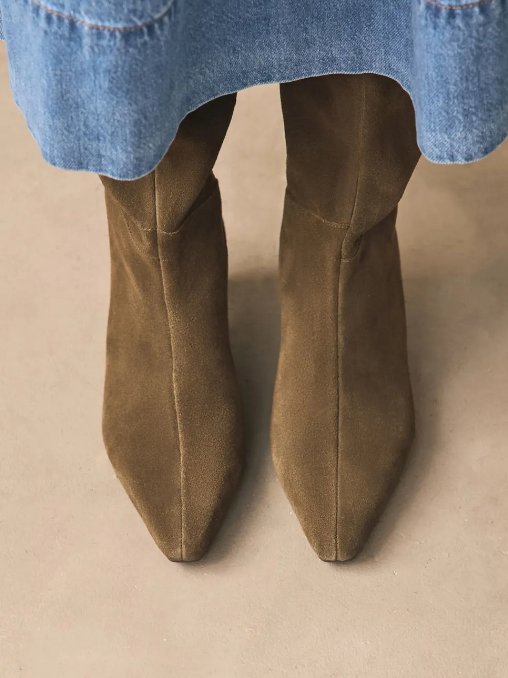 Next Forever Comfort® Knee High Chisel Toe Heeled Boots Khaki Green Suede Sale
