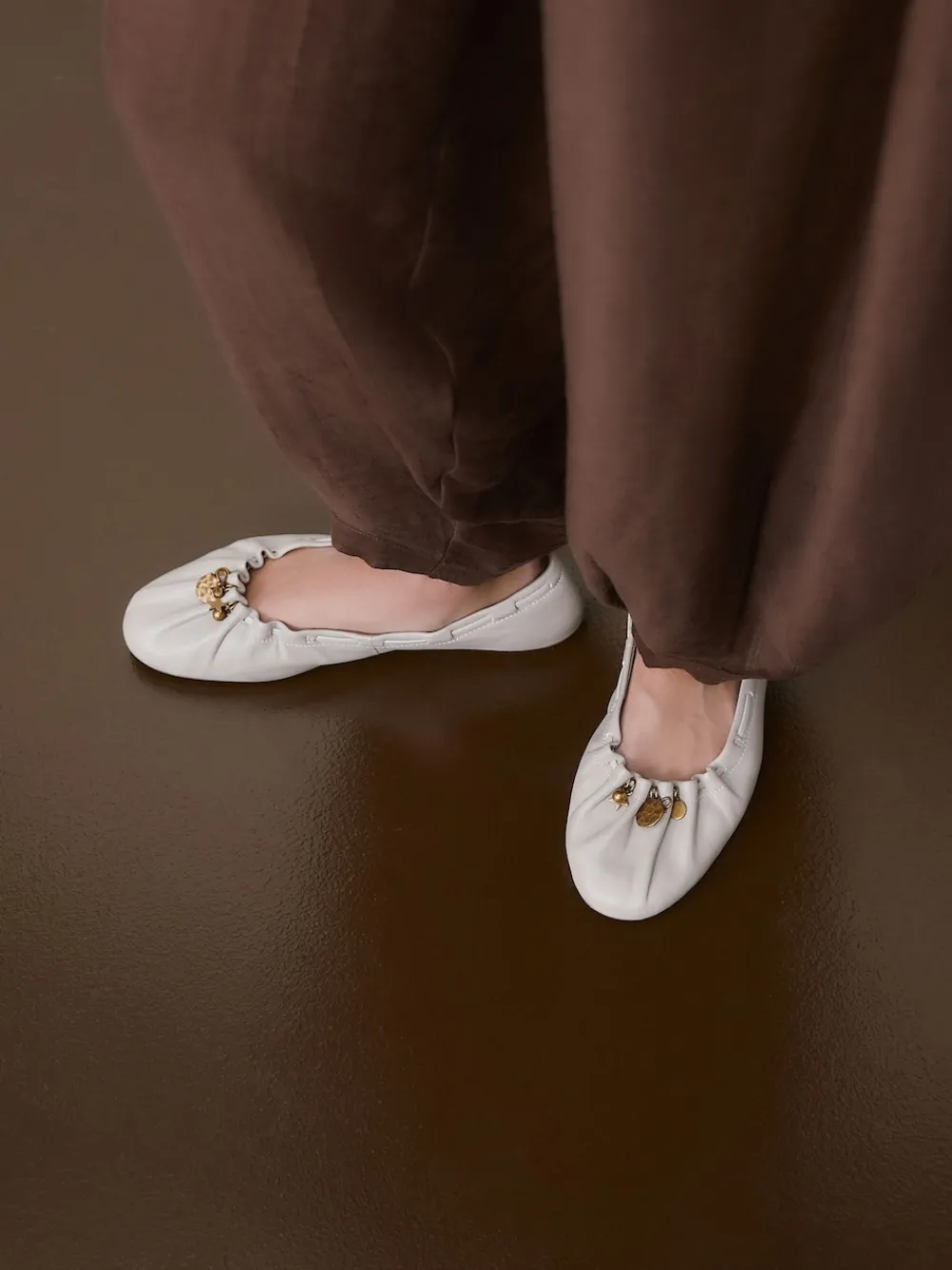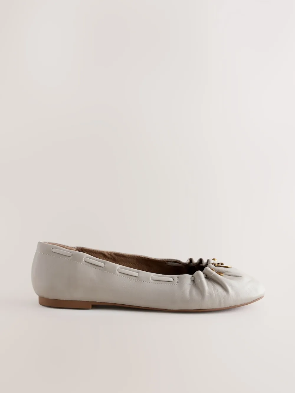 Stay effortlessly chic with these elegant ballet flats, perfect for adding a sophisticated touch to your everyday wardrobe. Crafted from premium leather, they feature a modern ruched topline and unique gold charm details. The Forever Comfort® padding ensures all-day ease for any occasion. Round toe ballet flat Ruched topline Gold charm details Forever Comfort® technology Upper – Leather, Lining & Sock – Textile, Other Materials, Sole – Other Materials.
