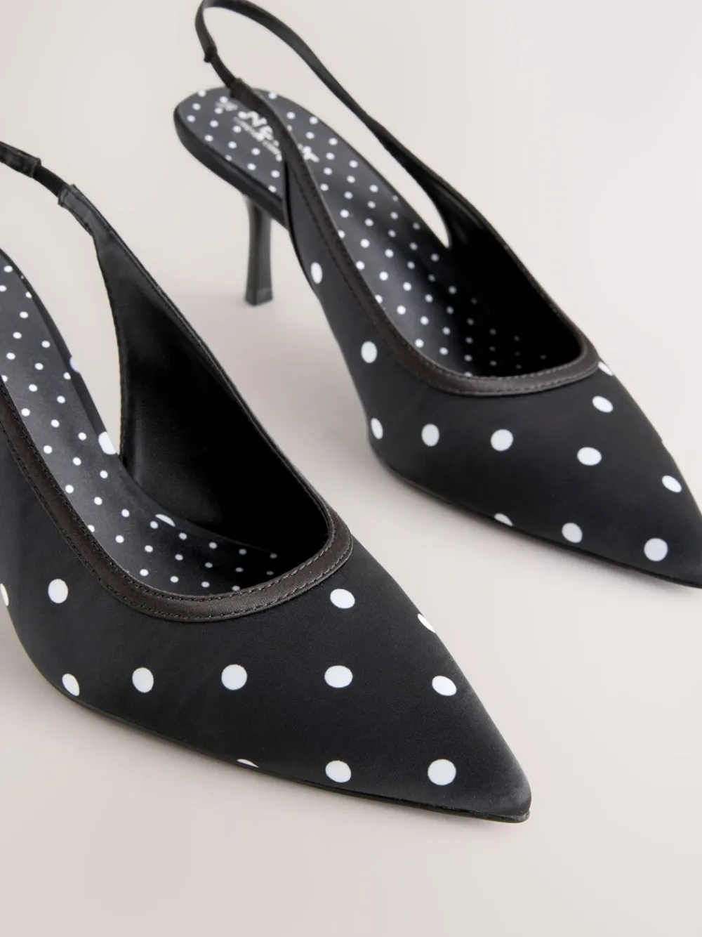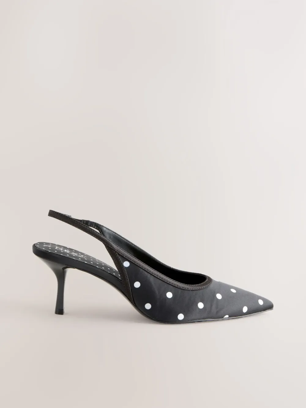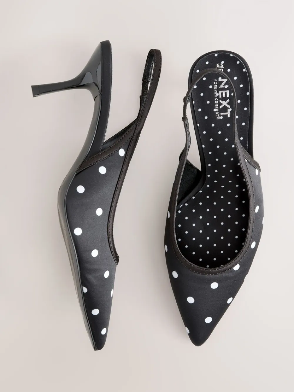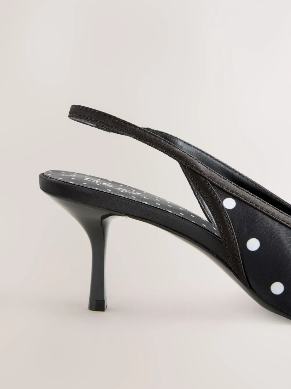 These Black/White Polka Dot Slingback Heels redefine feminine elegance with timeless chic. The distinctive polka dot satin upper and sharp pointed toe make an effortless statement. Engineered with Forever Comfort® padding, the mid-height heel offers unparalleled comfort, making these the perfect versatile choice for refined evening wear or elevated everyday styling. Distinctive polka dot upper Mid-height heel and pointed toe Slingback strap Forever Comfort® padded footbed Heel height 7cm. Upper – Textile, Lining & Sock – Textile, Other Materials, Sole – Other Materials.