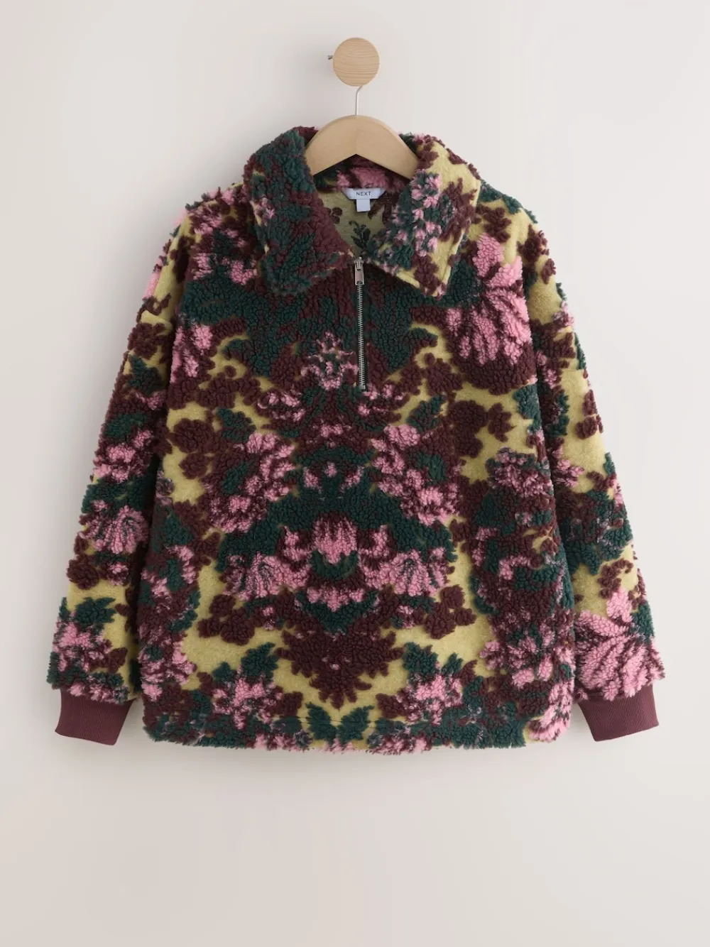 Next Jacquard Teddy Borg Quarter Zip Fleece Sweatshirt Green Floral Best