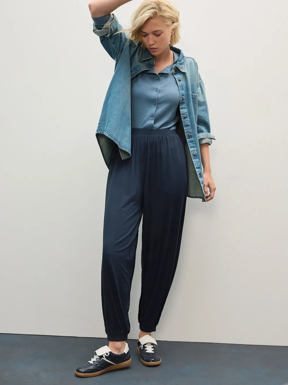 Comfortable, figure flattering and versatile, these navy jogging bottoms are made from a soft jersey fabric in a Harem shape, featuring an elasticated waistband and ankle cuffs, finished with side pockets. Elasticated waistband Side pockets Cuffed ankles Regular to fit inside leg 29″ / 74cm. Long to fit inside leg 31″ / 79cm. XL Tall to fit inside leg 33″ / 84cm. Machine washable. 95% LENZING™ ECOVERO™ Viscose, 5% Elastane. Our tall collection is designed to fit women 5’10” and above. This has been proportionally increased through the body, leg and sleeve to achieve the perfect fit. Available in sizes 8-20.