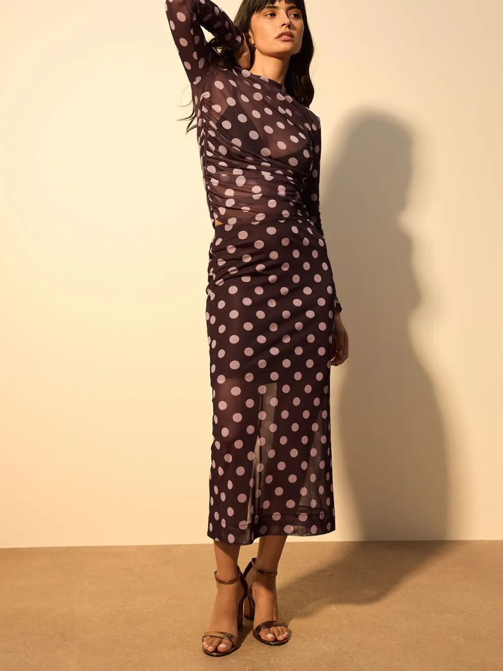 Make a stunning statement in this trendy polka dot mesh midi pencil skirt. The design is cut in a regular fit and is a versatile wardrobe hero for evenings or chic daytime looks. Mesh design Polka dot print Flattering pencil shape Regular fit Machine washable. Main 95% Recycled polyester, 5% Elastane. Lining 100% Recycled polyester. Items with the curve logo are available in sizes 18 and above., Our tall collection is designed to fit women 5’10” and above. This has been proportionally increased through the body, leg and sleeve to achieve the perfect fit. Available in sizes 8-20.