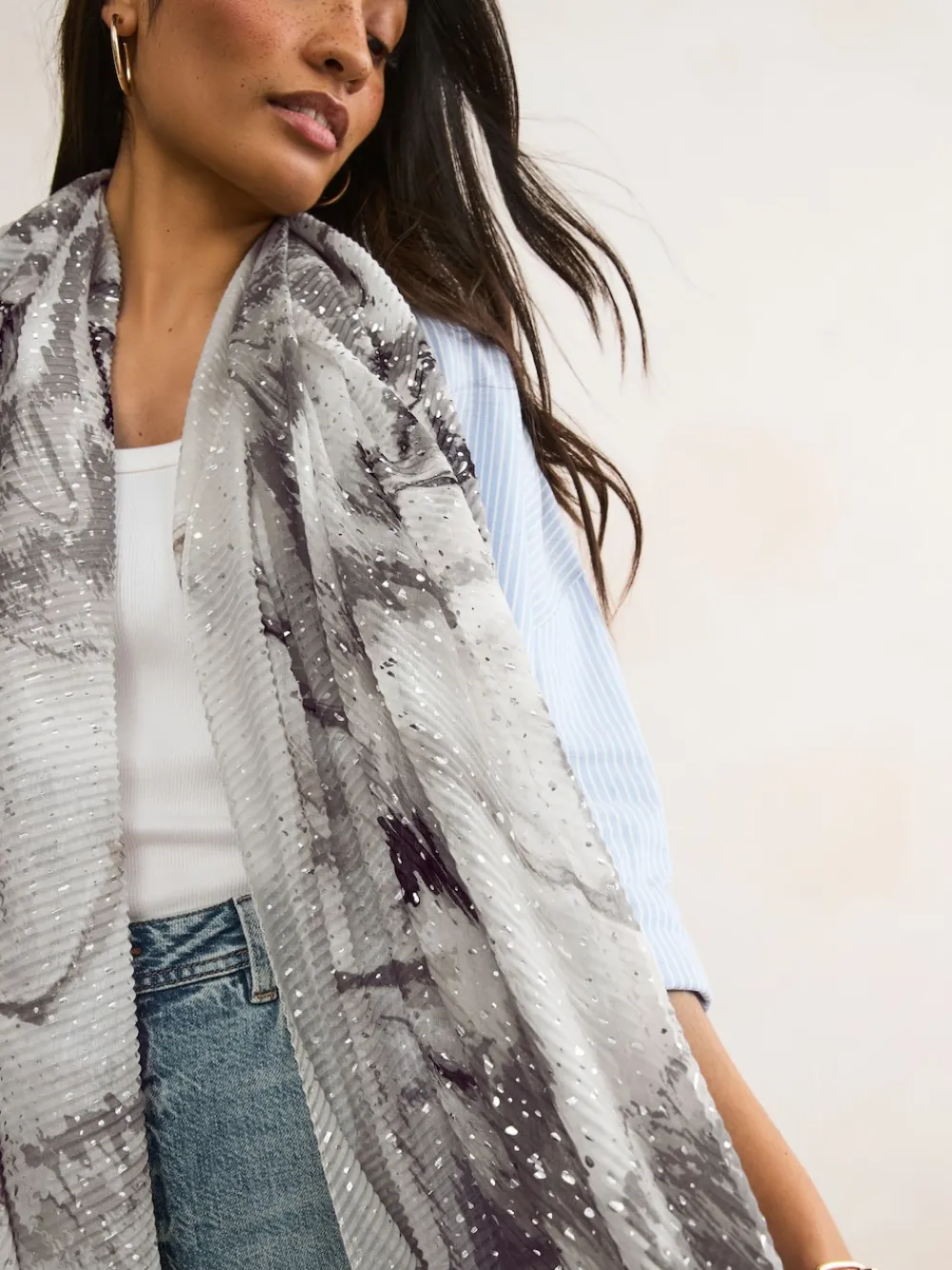 This monochrome stylish scarf has a marble-effect print with a lightweight plisse fabric, perfect for year-round wear to add a statement look to any outfit. Lightweight Plisse fabric Marble print Length 180cm Width 70cm 100% Recycled polyester.