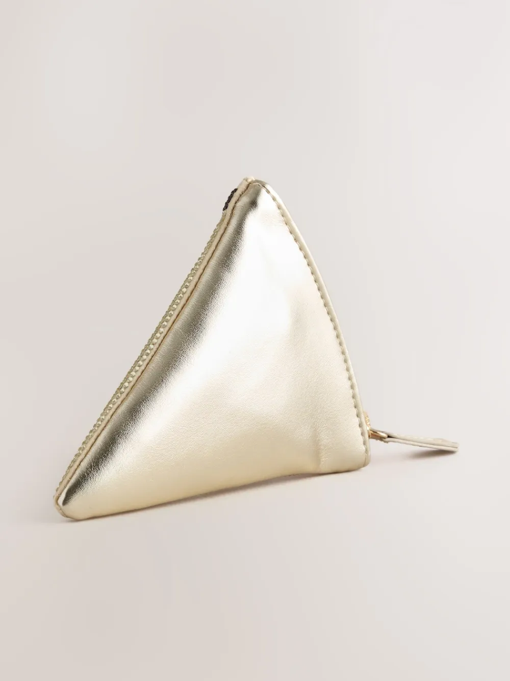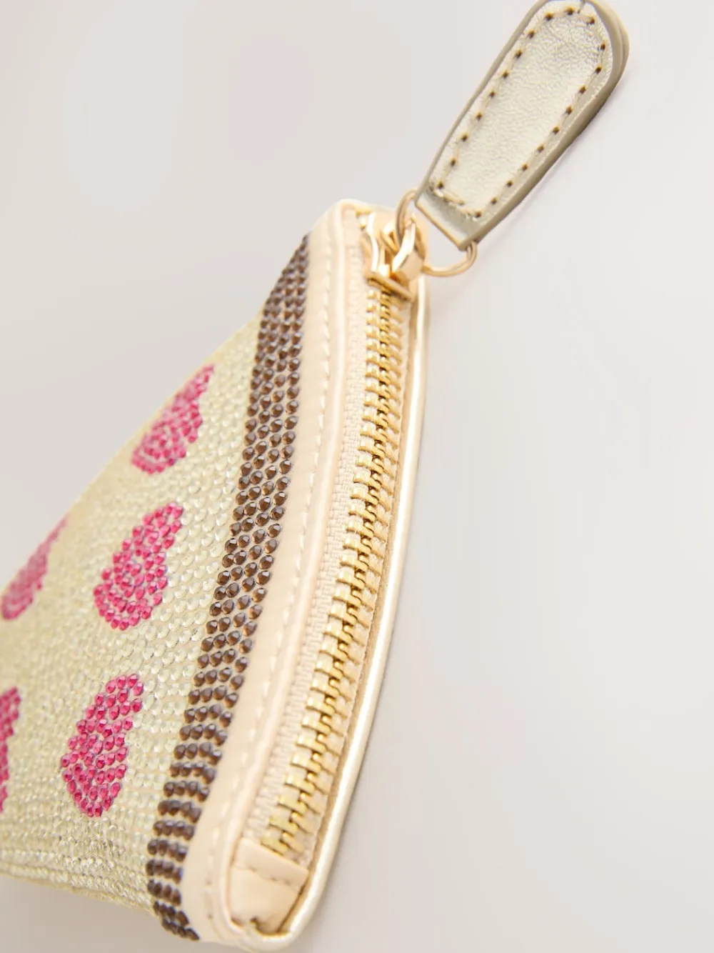 Add a fun and quirky accessory to your bag with this playful pizza-shaped coin purse. The novelty design features charming embellished detailing with pink hearts over a shimmering gold-toned base. Perfect for storing coins or small essentials, it has a secure zip fastening and is sure to raise a smile. Novelty pizza slice shape Embellished heart detailing Zip fastening Ideal for coins and small essentials Height 13cm Width 11cm Depth 2.5cm Outer 50% Polyester, 50% PU. Lining 100% Recycled polyester.