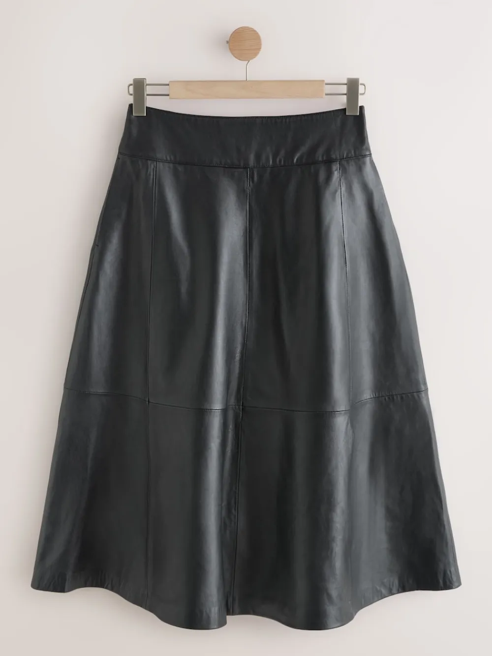 Invest in this premium leather skirt, an essential for your autumn/winter wardrobe. The full silhouette and high-quality real leather instantly elevate any outfit. Practical pockets ensure functionality for chic everyday or evening wear. Leather Full skirt style Pockets Midi length Specialist dry clean. Shell 100% Leather. Lining 100% Polyester.
