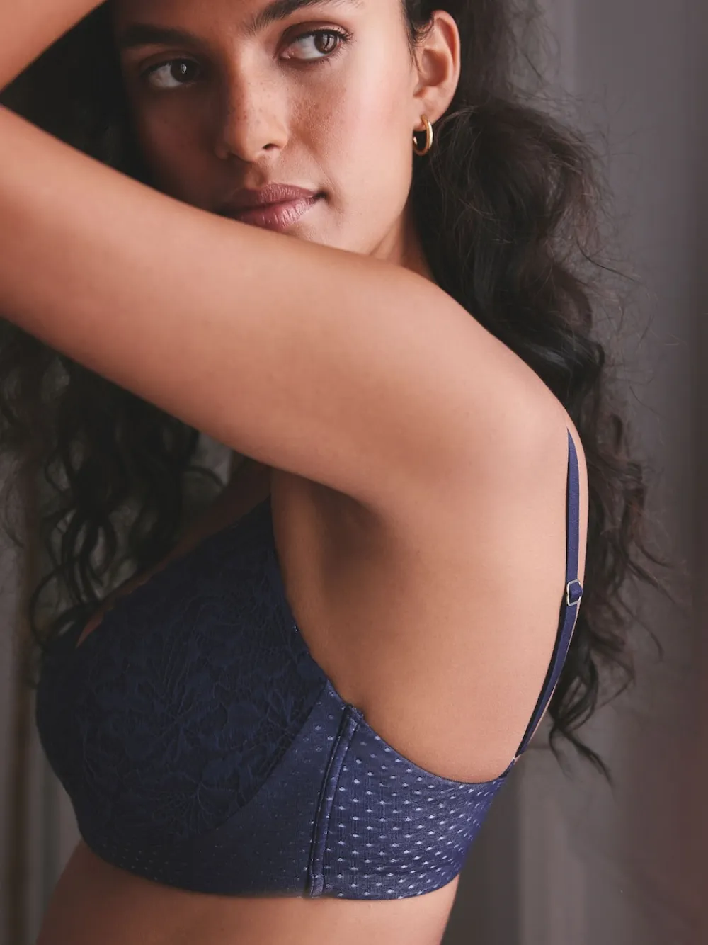 Celebrate your natural silhouette in this elegant lace navy blue bra. Featuring no padding, the underwired cups offer support and lift in all the right places and do not compromise on comfort. Plunge neckline Lace fabric Non-padded Underwired cups Machine washable. 50% Nylon, 23% Polyester, 19% Modal, 8% Elastane.