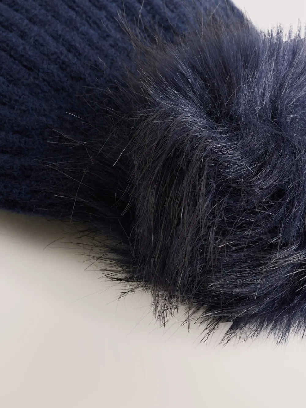 Stay snug and stylish in our rib knit pom pom hat. Rib knit Faux fur pom pom Cosy Main 45% Acrylic, 29% Recycled polyester, 26% Nylon. Trim 74% Acrylic, 15% Modacrylic, 11% Polyester.