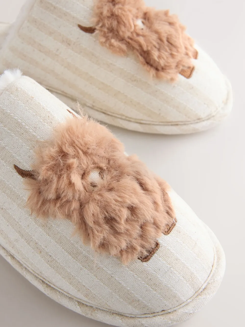 Relax in style with these charming neutral Hamish linen mule slippers, perfect for slow mornings and quiet evenings at home. These easy slip-on slippers feature a classic cream and beige striped upper, prominently adorned with a cute, 3D fluffy Hamish the Highland cow character on the front. Designed for ultimate comfort, they are lined with a super-soft, white faux-fur interior to keep your feet warm and cosy. Hamish linen mule slippers for a touch of country charm Easy slip-on design for convenience Super comfy faux-fur lining for extra warmth 3D fluffy Highland cow character detail Neutral striped Upper – Textile, Lining & Sock – Textile, Sole – Textile, Other Materials.