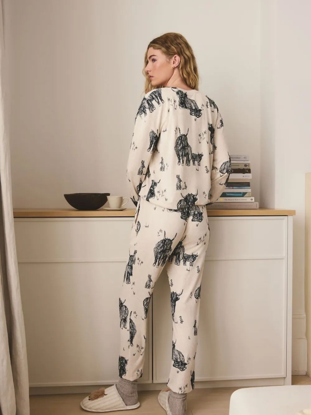 Ensure a wonderfully comfortable night’s sleep with this super soft pyjama set. It features a fun, all-over sketch of Hamish the Highland Cow, offering warmth and playfulness. Also available as a short set and in maternity style. Long sleeves Highland Cow print Super soft fabric Available in short set and maternity style Machine washable. Pyjama Top and Pyjama Bottom 96% Recycled polyester, 4% Elastane. Warning: Keep away from fire and flames., Our tall collection is designed to fit women 5’10” and above. This has been proportionally increased through the body, leg and sleeve to achieve the perfect fit. Available in sizes 8-20.