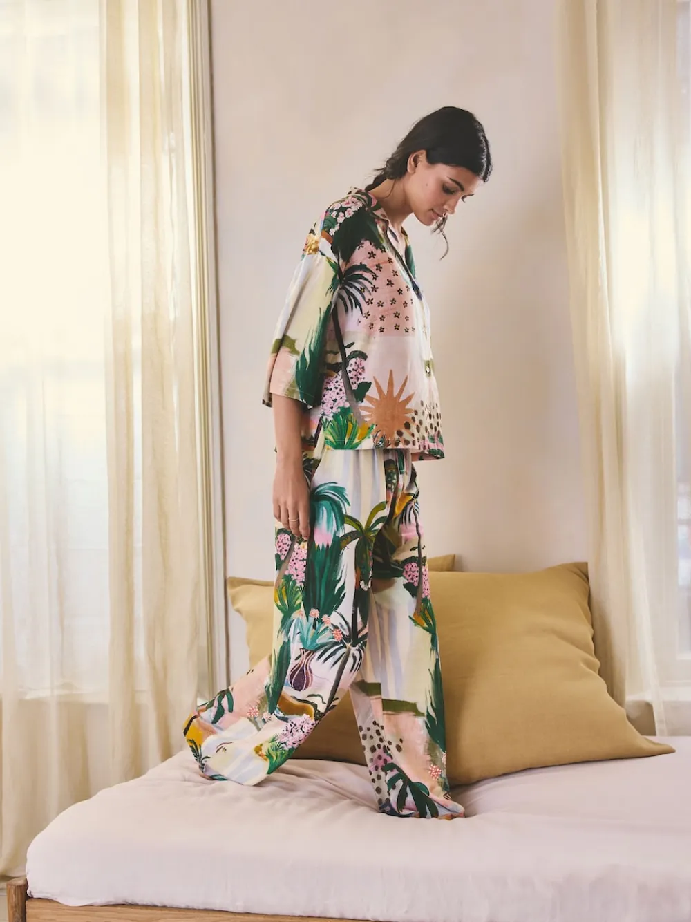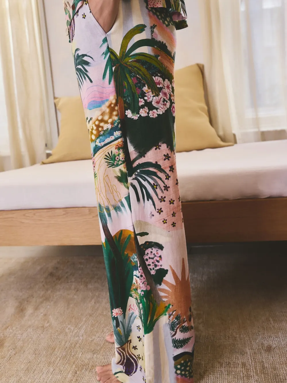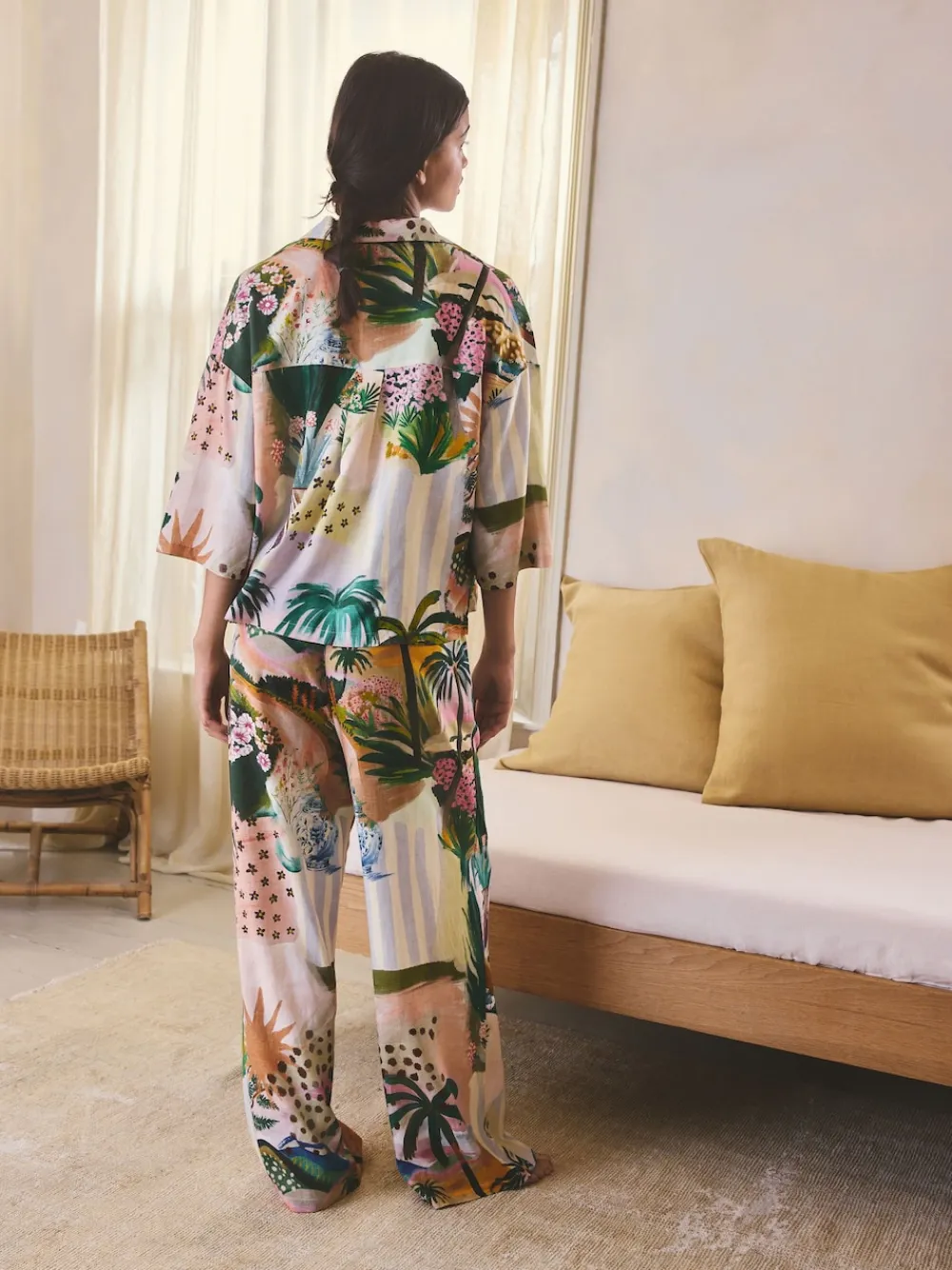 Lounge in tropical style with this super comfy button-through pyjama set. The linen blend offers a soft, breezy feel, adorned with a vibrant all-over palm print. Perfect for warm-weather relaxation or glamorous downtime. Linen blend fabric Palm print Button-up fastening Collar neckline Machine washable. Pyjama Top and Pyjama Bottom 85% LENZING™ ECOVERO™ Viscose, 15% Linen. Items with the curve logo are available in sizes 18 and above., Warning: Keep away from fire and flames.