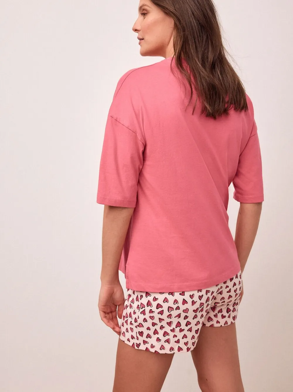 Snuggle up in this super soft and comfy maternity short pyjama set. The pink top features a relaxed fit with wide sleeves, complementing the adorable all-over heart print on the shorts. This lightweight set is perfect for comfortable lounging and bedtime, designed to accommodate your bump. Short pyjama set Super soft lightweight fabric All-over heart print on shorts Relaxed fit top with wide sleeve Maternity fit Available in non-maternity style Comfortable loungewear Machine washable. Pyjama Top and Pyjama Bottom 100% Cotton. Warning: Keep away from fire and flames.