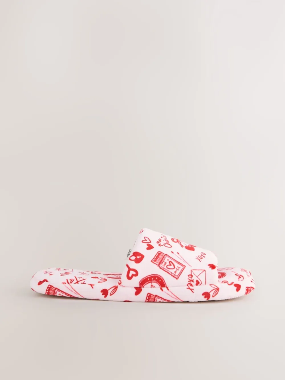Bring a playful and romantic touch to your loungewear with these pink and red heart plush slider slippers. Designed for ultimate relaxation, these slippers feature an all-over conversational heart print, including charming motifs like Cupid’s arrows and ‘Love’ lettering in vibrant red against a soft pink base. The plush, cushioned construction and open-toe slider silhouette ensure they are super comfy and easy to slip on for a cozy evening at home. All-over heart and ‘Love’ conversational print Super comfy plush slider design Soft, cushioned footbed for added comfort Easy-to-wear open-toe silhouette Upper – Textile, Lining & Sock – Textile, Sole – Textile, Other Materials.