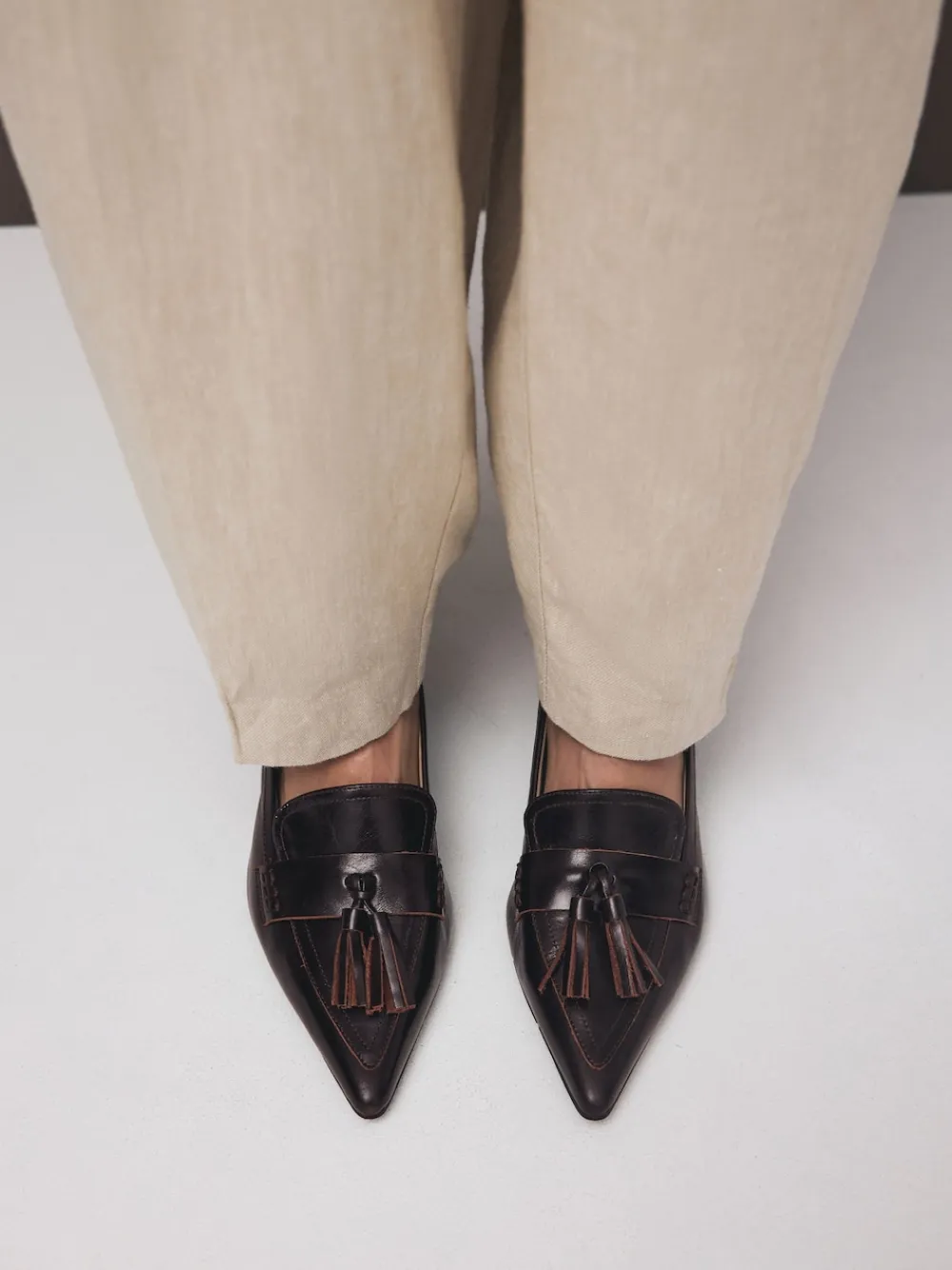 Next Premium Leather With Motionflex Point Toe Tassel Heels Loafers Choc Brown Outlet