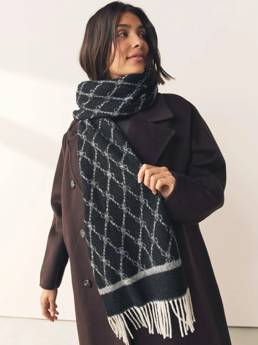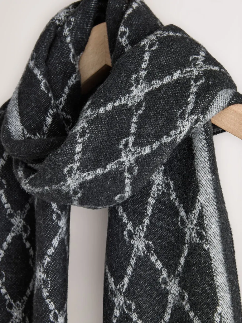 Next Premium Made in Italy Jacquard Monogram 100% Wool Midweight Scarf Grey/Black Clearance