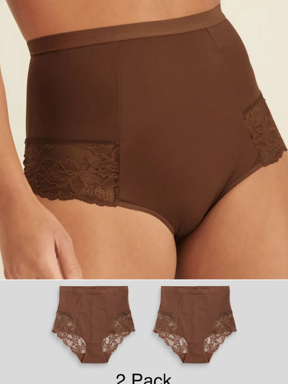 This two – pack of shaping Chocolate Nude knickers is high-waisted for a comfortable and flattering fit underneath any outfit and features soft lace for added feminine detail. Pack of two Lace trim detail Stretch fabric Elasticated waistband High waist Tummy control Cotton gusset Machine washable. 2 x Knickers Main 68% Nylon, 32% Elastane. Gusset 100% Cotton. Items with the curve logo are available in sizes 18 and above.