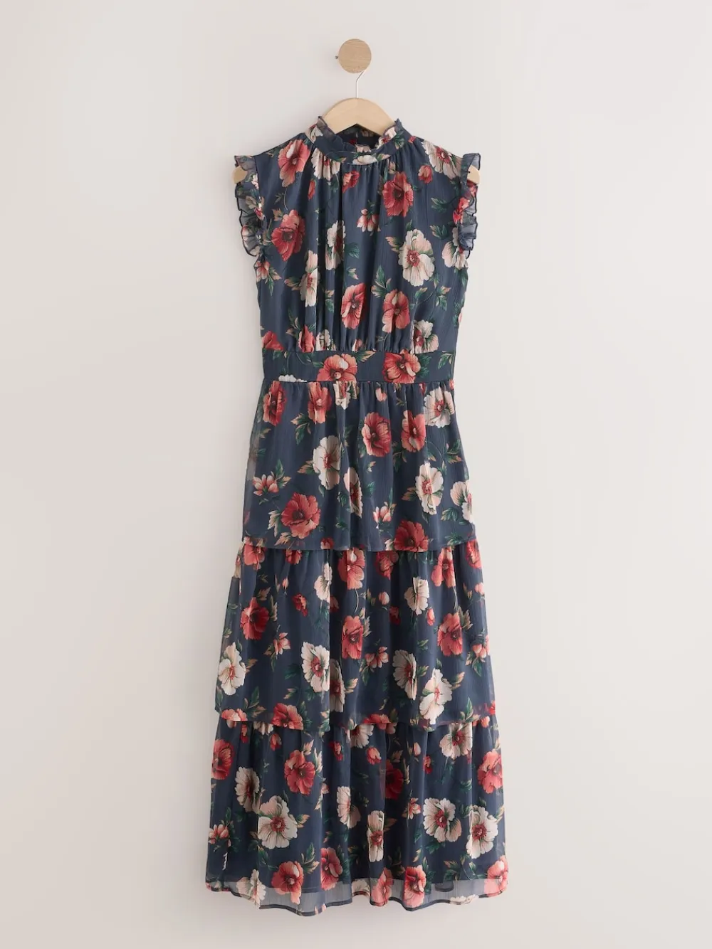 Next Printed High Neck Tiered Occasion Maxi Dress Navy Blue Floral Discount
