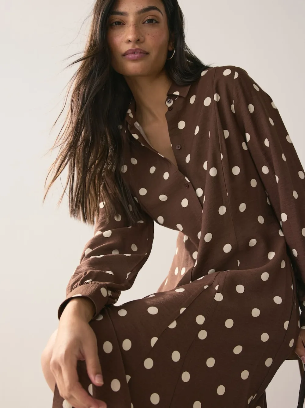 Next Printed Long Sleeve Shirt Dress Chocolate Brown/Ecru Polka Dot New