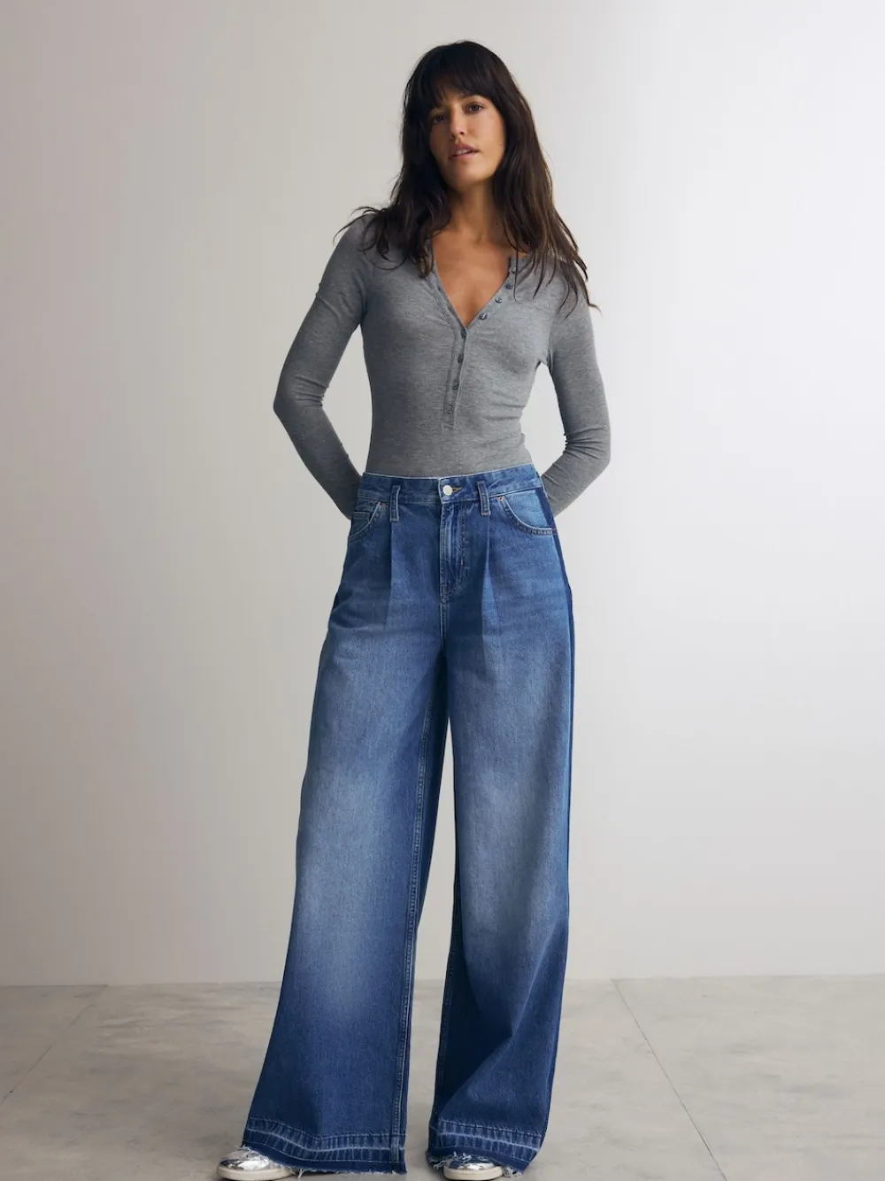 This long sleeve grey bodysuit is made from a soft ribbed jersey fabric with a Henley-style button fastening and a popper fastening to the crotch, perfectly paired with your favourite wide leg trousers or jeans. Regular fit Long sleeve Soft ribbed fabric Henley style neck Popper fastening Machine washable. 63% Recycled polyester, 33% Livaeco™ Viscose, 4% Elastane.