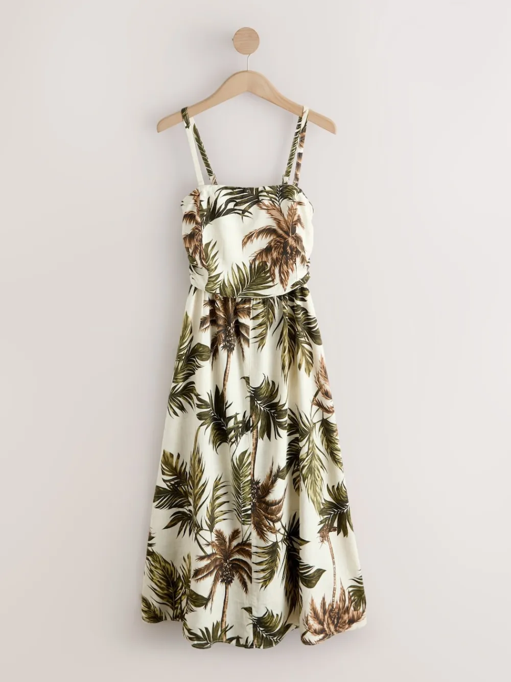 Next Ruched Bandeau Midi Dress with Linen Khaki/Cream Palm Printed Clearance