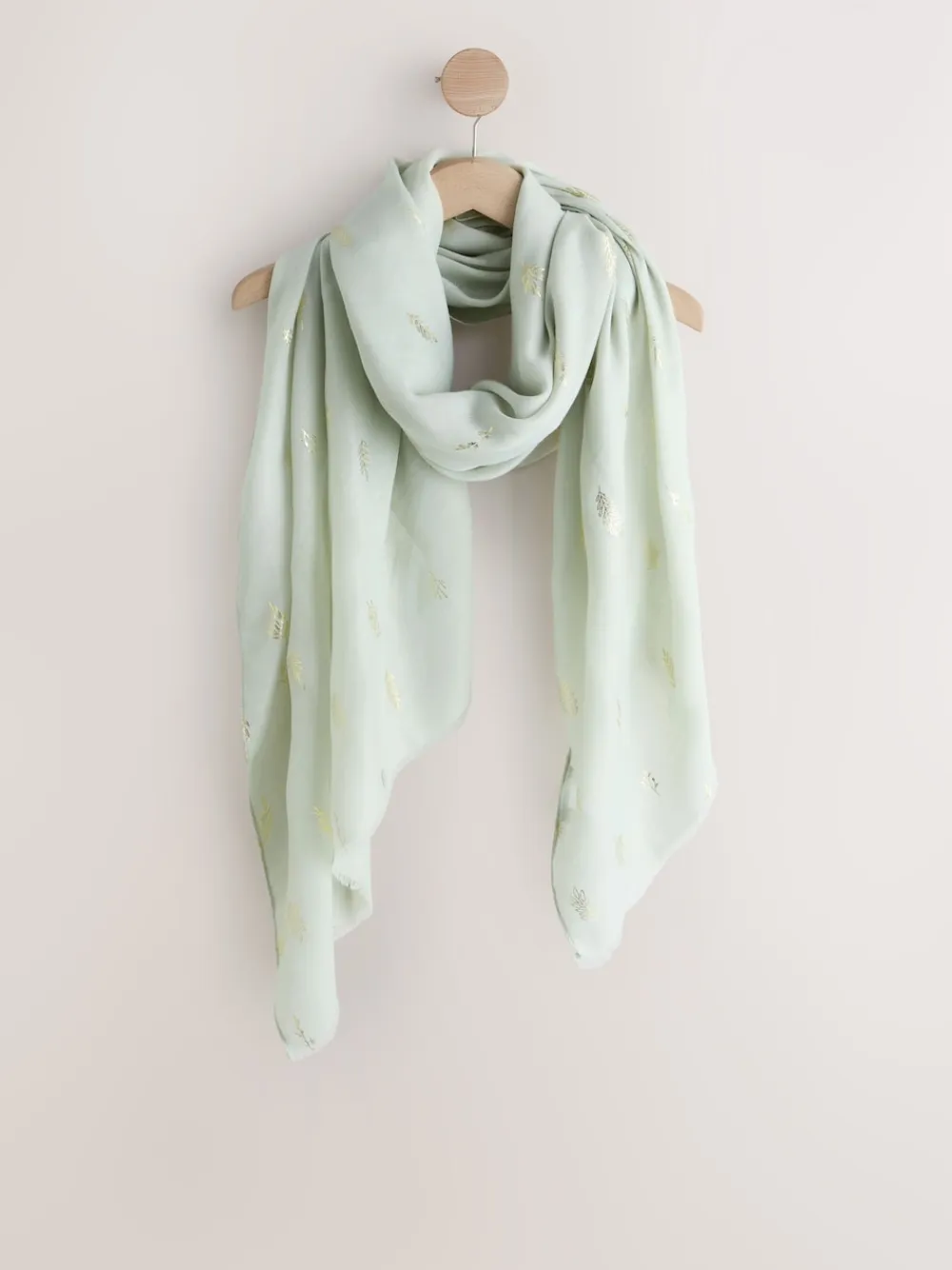 Add a subtle touch of glamour to your ensemble with this elegant lightweight scarf. The soft sage green base is beautifully detailed with scattered gold foil accents for a gentle shimmer. Its flowing, airy fabrication makes it a perfect versatile layer for any smart-casual occasion. Lightweight Scattered gold foil detailing Soft, airy fabrication Length 180cm Width 70cm 100% Recycled polyester.