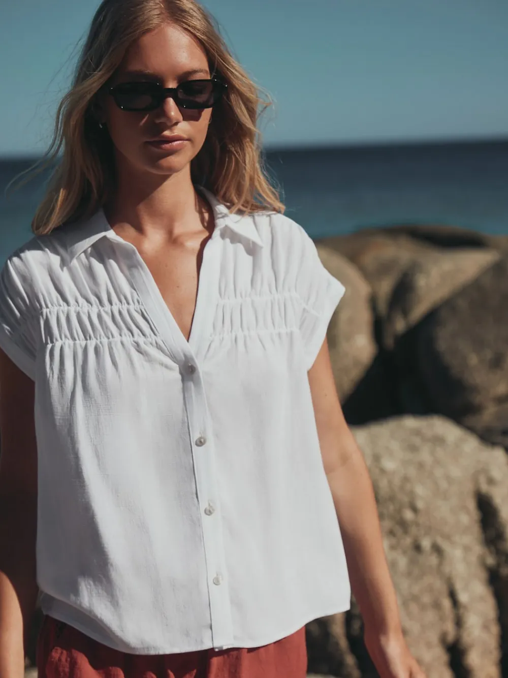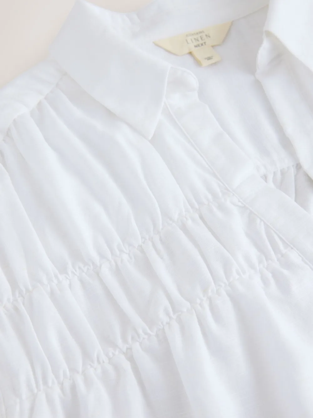 Achieve a sophisticated, relaxed aesthetic with this breezy short-sleeved blouse. Featuring a classic collar, V-neck, and full button-up fastening, the smock detailing provides subtle texture. Perfect for versatile and comfortable everyday styling. Smock detailing Short sleeve Collar and V-neckline Button-up fastening 68% Livaeco™ Viscose, 16% Lyocell, 16% Linen. Items with the curve logo are available in sizes 18 and above.