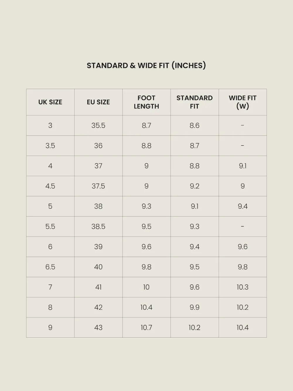 | Size | US 5 (UK 3), US 5.5 (UK 3.5), US 6 (UK 4), US 6.5 (UK 4.5), US 7 (UK 5), US 7.5 (UK 5.5) |