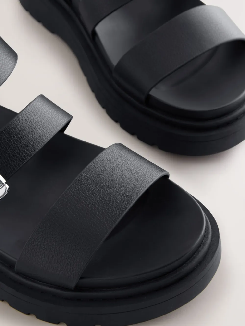 Get ready for summer, with these holiday-friendly sandals. Featuring a strappy black faux leather upper with adjustable buckle fastenings, an open toe and a smooth synthetic footbed, finished with a chunky outsole. Strappy upper Open toe Adjustable buckle fastening Synthetic footbed Chunky outsole Upper – Other Materials, Lining & Sock – Other Materials, Sole – Other Materials. Wide fit shoes and short ankle boots provide extra width across the foot. Wide fit long boots provide extra width across the foot and through the leg at the calf.