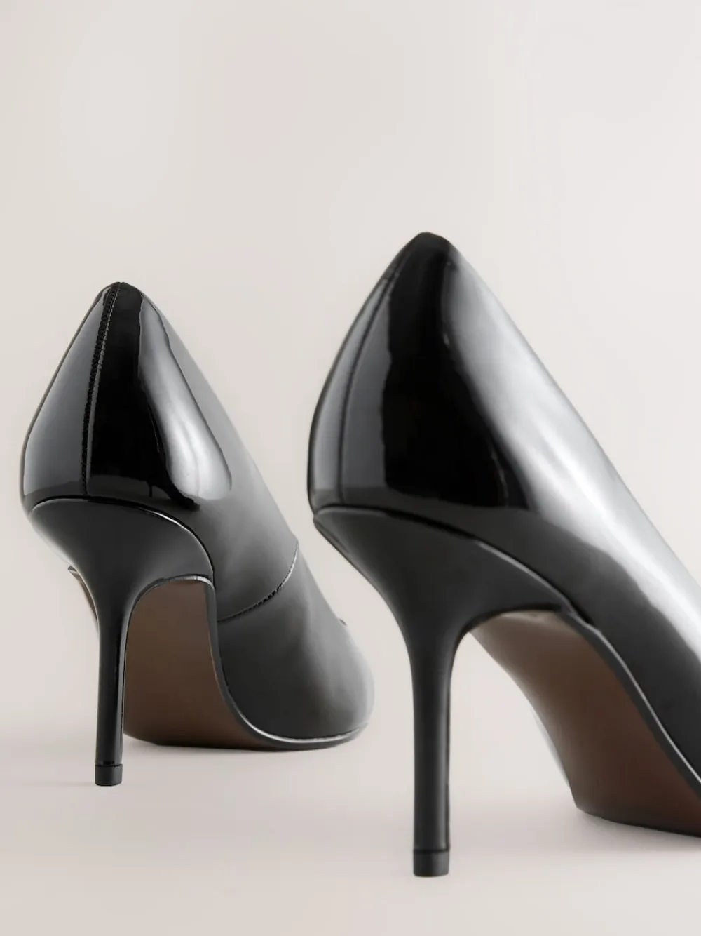 Step into timeless elegance with these Black Patent Forever Comfort® Pointed Mid Court Shoes. The glossy patent upper and chic pointed toe make these shoes perfect for work or any occasion. Designed for all-day wear, the slip-on style is enhanced with Forever Comfort® padding for superior cushioning. Patent upper Pointed toe Forever Comfort® padding Slip-on court style Stiletto heel Heel height 8.5cm. Upper – Other Materials, Lining & Sock – Other Materials, Sole – Other Materials.