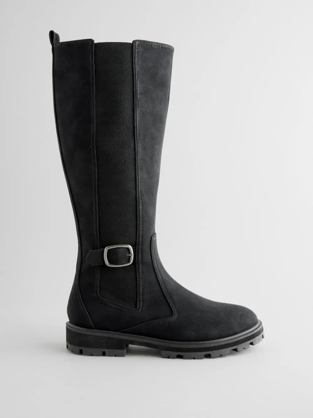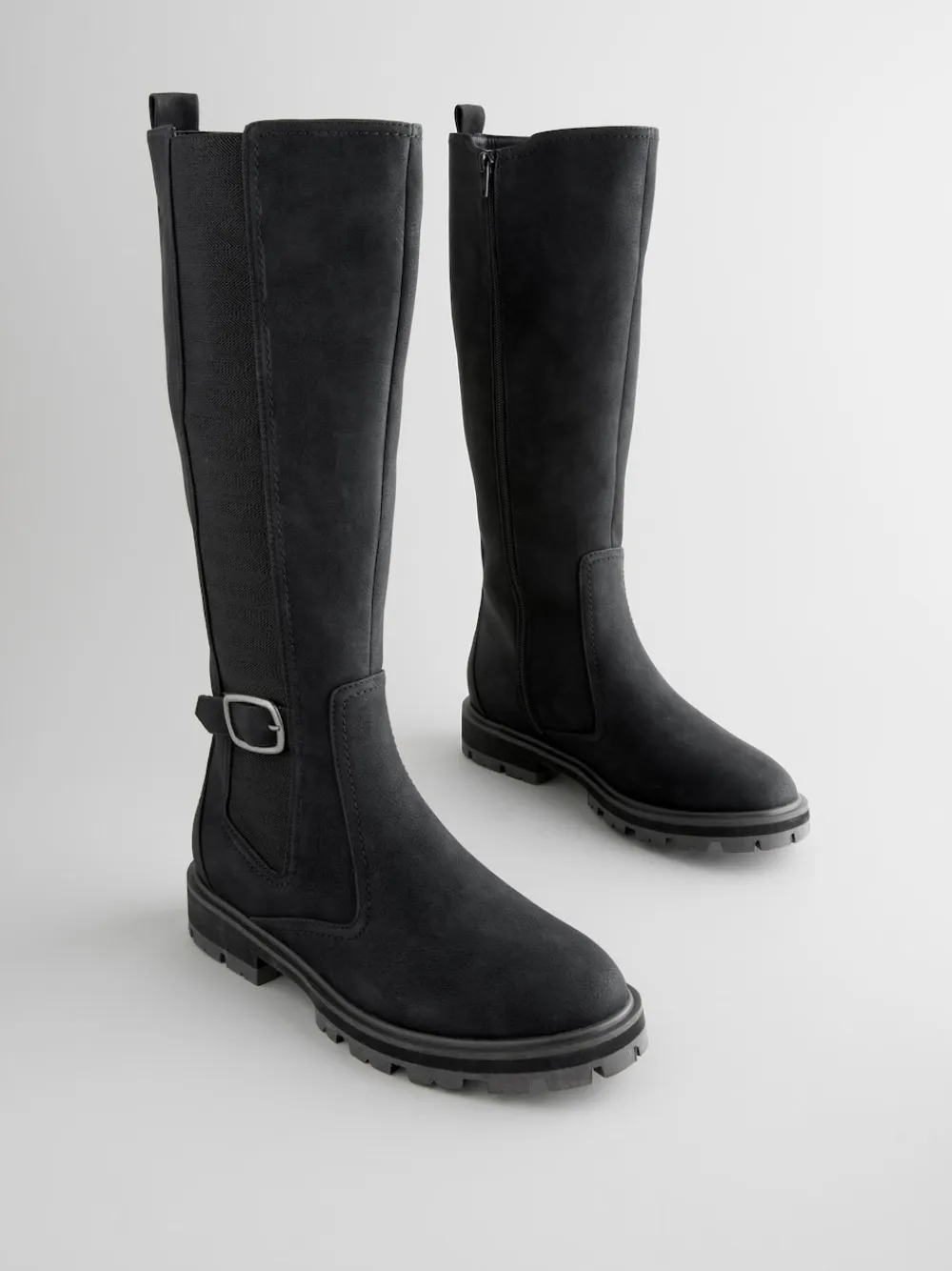These black knee-high boots features a Chelsea-inspired design with a faux suede upper, an elasticated side panel and a zippered fastening for easy wear, alongside a buckle and strap. A Forever Comfort® cushioned footbed provides comfort in every step, finished with a durable outsole. Regular width Faux suede upper Stretchy side panel Zippered fastening Round toe Buckle and strap detail Forever Comfort® footbed Durable outsole Upper – Other Materials, Textile, Lining & Sock – Textile, Other Materials, Sole – Other Materials. Wide fit shoes and short ankle boots provide extra width across the foot. Wide fit long boots provide extra width across the foot and through the leg at the calf.