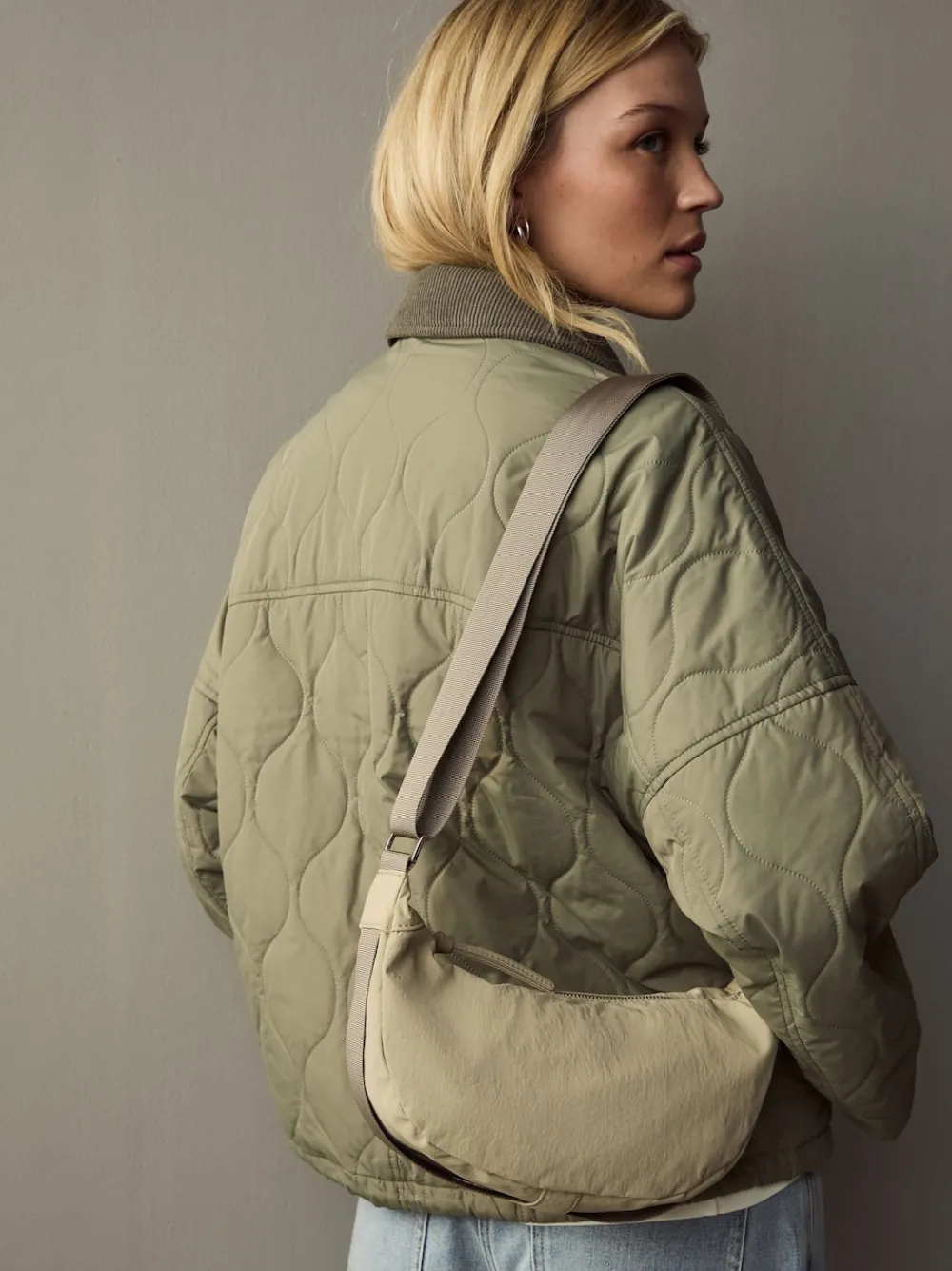 This black sling bag is perfect for carrying your small daily essentials, with a raffia design that brings the holiday vibe from the airport to the beach bar. The bag has an adjustable shoulder strap with a zippered main pocket. Sling bag Raffia design Adjustable shoulder strap Zippered main compartment Height 15.5cm Width 30cm Depth 9.5cm Main 100% Nylon. Lining 100% Recycled polyester.