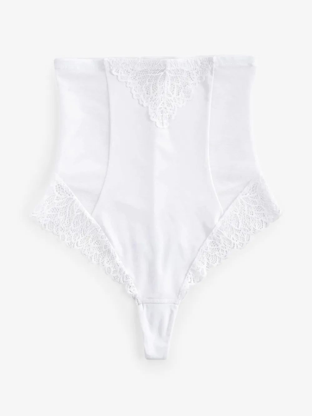 With a high waist, this white underwear firms and shapes your tummy for a smoothing effect under clothing, finished in a thong bottom shape with delicate lace detailing. High waist Firm tummy control Shaping thong Lace detail Machine washable. Main 81% Nylon, 19% Elastane. Gusset 100% Cotton. Items with the curve logo are available in sizes 18 and above.