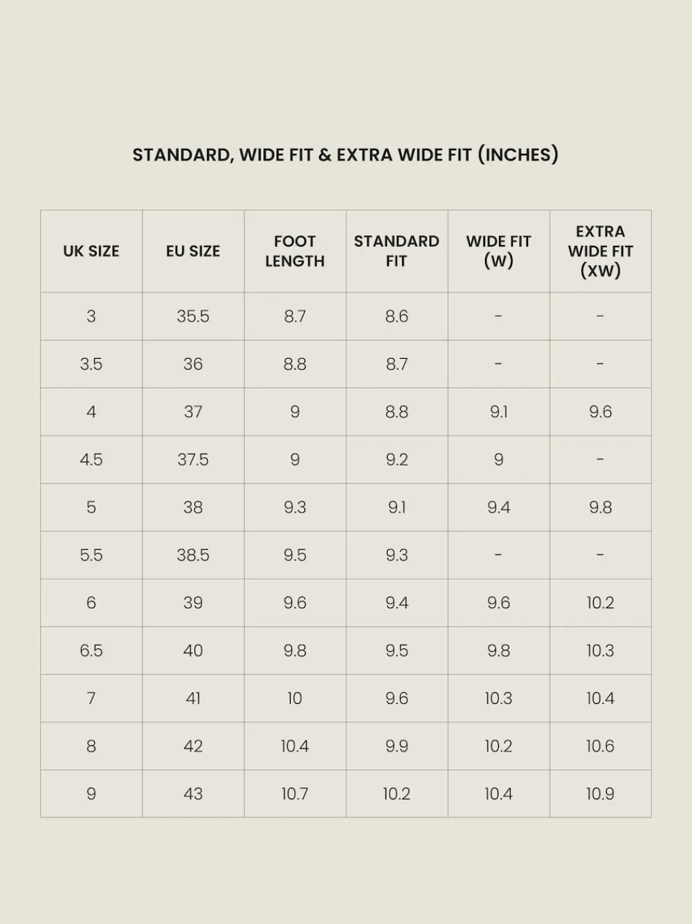 | Size | US 6 (UK 4), US 7 (UK 5 XW), US 8 (UK 6), US 8.5 (UK 6.5), US 9 (UK 7) |