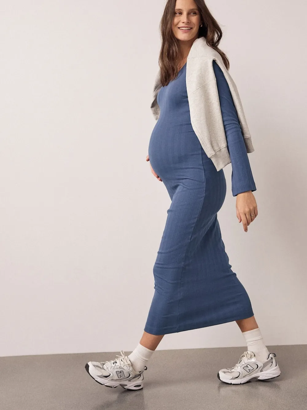 This ribbed dress is perfect for baby showers or stylish everyday wear. Crafted from soft rib knit material, the midi length and long sleeves offer warmth and elegance. The adjustable tie-back feature adds a flattering shape while ensuring comfortable growth with your bump. Midi length Soft rib knit material Tie back detailing V-neckline Long sleeve Fully adjustable fit Everyday/special occasion wear Regular side neck to hem 51″ / 130cm. 95% Cotton, 5% Elastane.