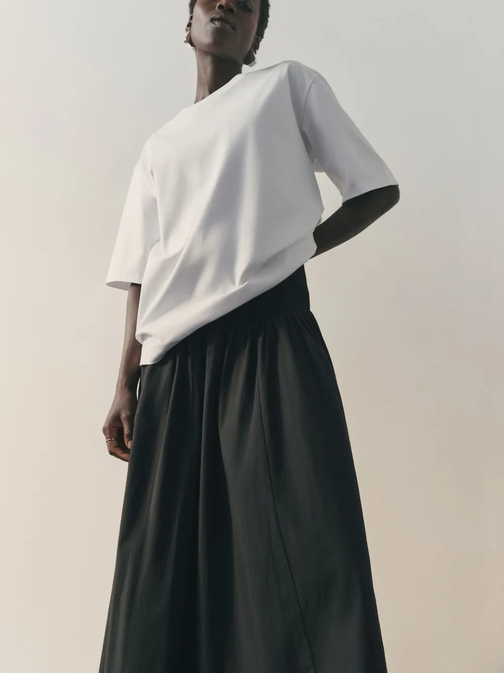 Experience elevated comfort with the Nothing Ordinary Jersey Woven Mix A-Line Heavyweight Cotton Midi Skirt. This piece beautifully embodies our brand’s mission to make the everyday exceptional, blending a casual feel with a sophisticated silhouette.The skirt features a soft, ribbed waistband for a comfortable and easy fit, which flows into a full, A-line shape. Crafted from 100% heavyweight cotton poplin, it has a beautiful structure and luxurious drape. This versatile skirt is a perfect day-to-night staple – pair it with a simple tee for a relaxed daytime look or dress it up with a sleek blouse for a chic evening outfit. Cotton poplin Midi length Ribbed waistband Main 99% Cotton, 1% Elastane. Skirt 100% Cotton.
