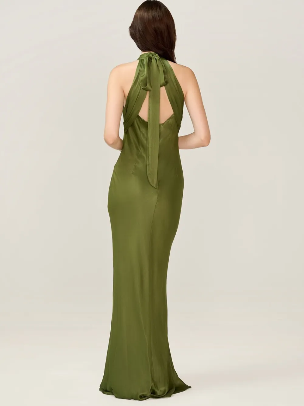 Designed with bridesmaids in mind, Milos pairs elegant detailing with a flattering, floor-length silhouette. Crafted in a deep pear green hue, it features a soft halter neckline that ties at the back in a romantic bow, framing an open back with subtle drama. The fluid drape moves beautifully; perfect for your next event. Machine washable. 100% Viscose.