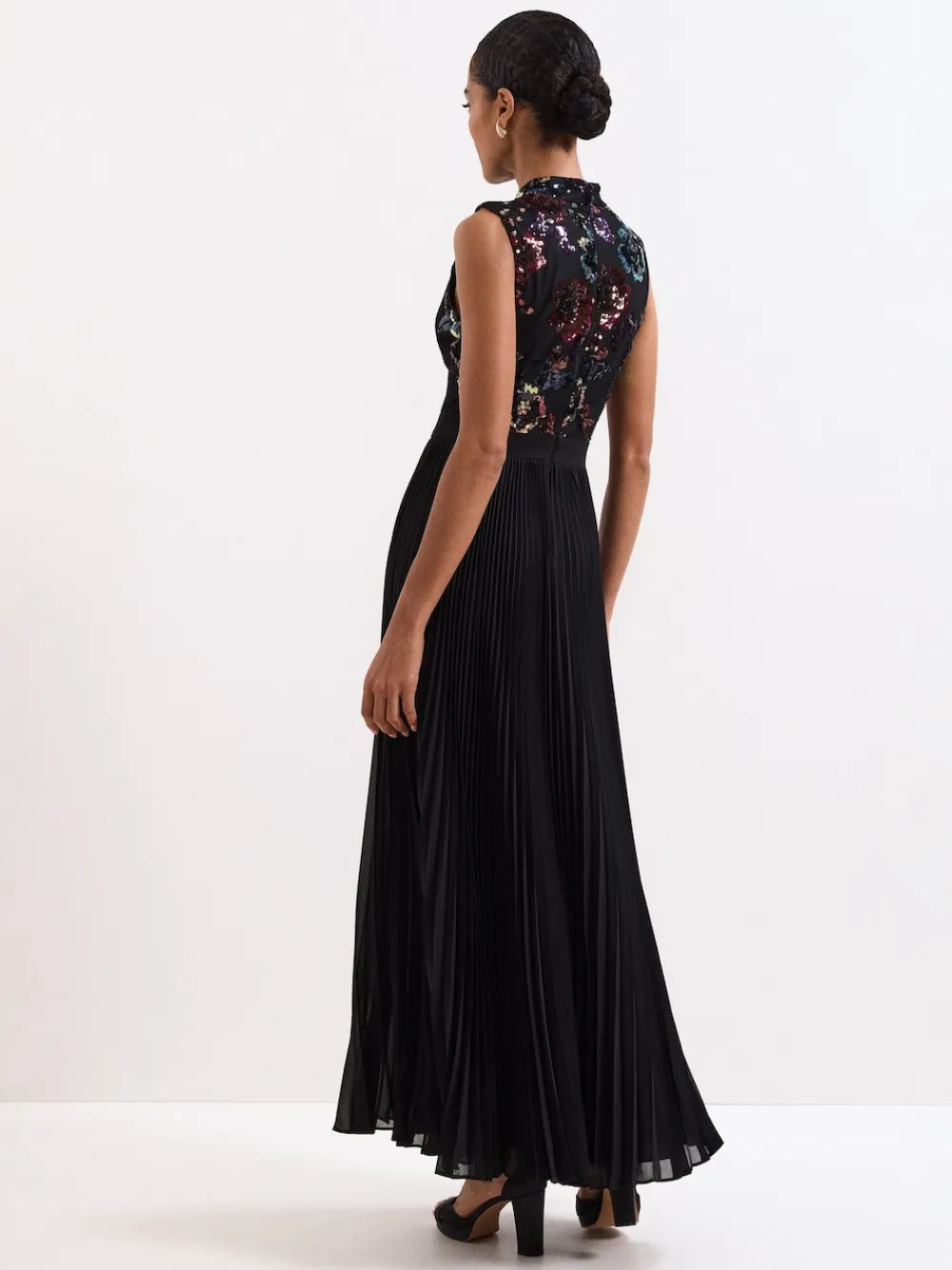 A black halterneck maxi dress with a twist. Embellished with sequins and curated in a unique floral pattern for maximum impact. This dress features a pleated skirt for fluidity and movement, perfect for all your special occasions. Specialist dry clean. 95% Polyester, 5% Elastane.