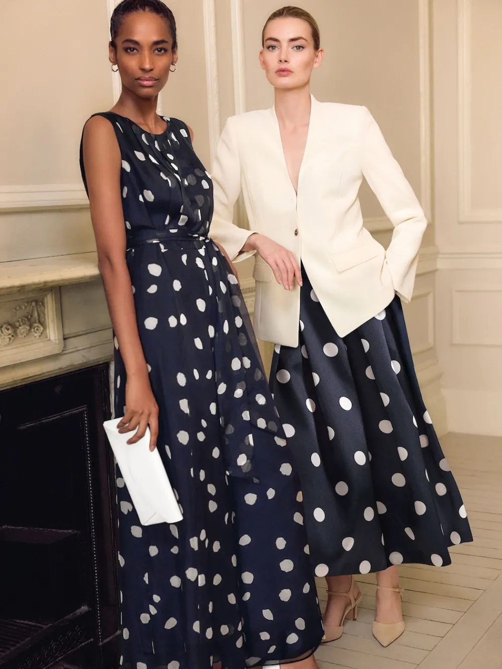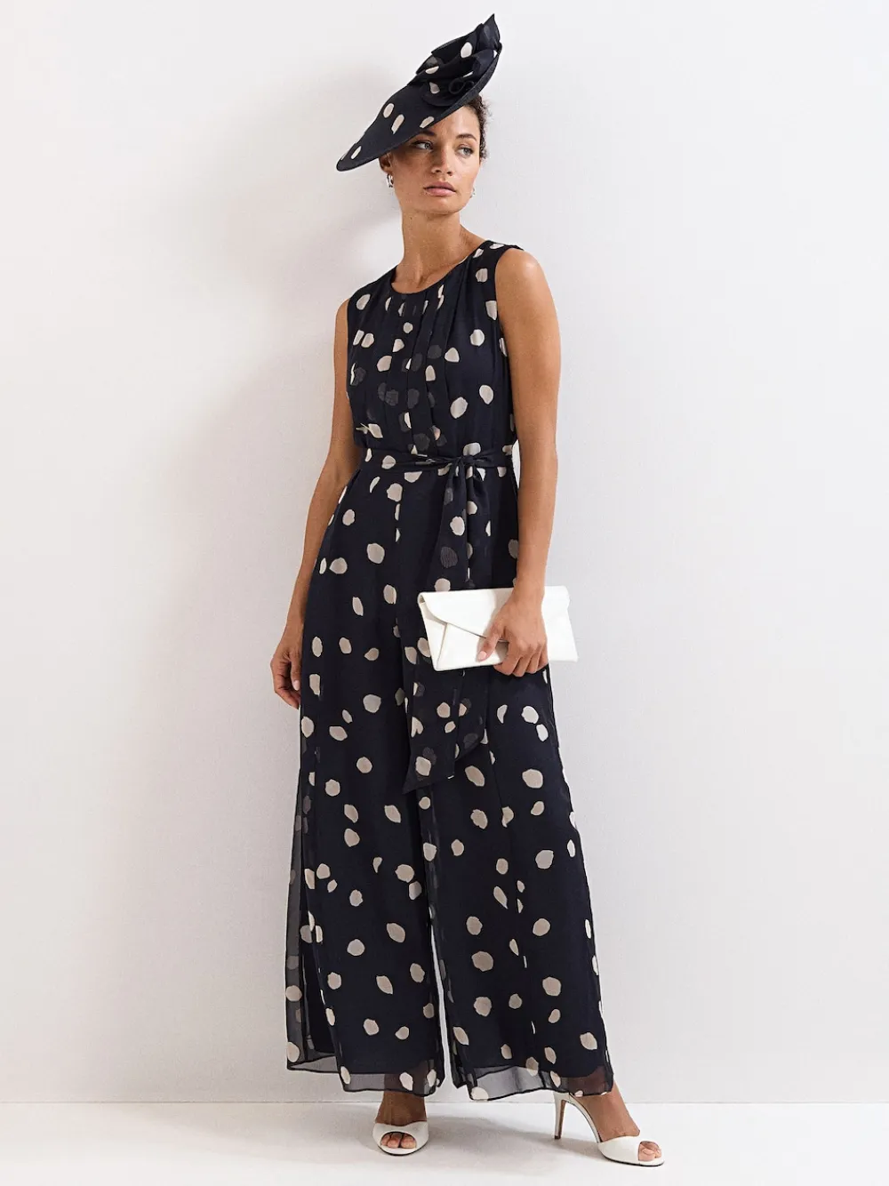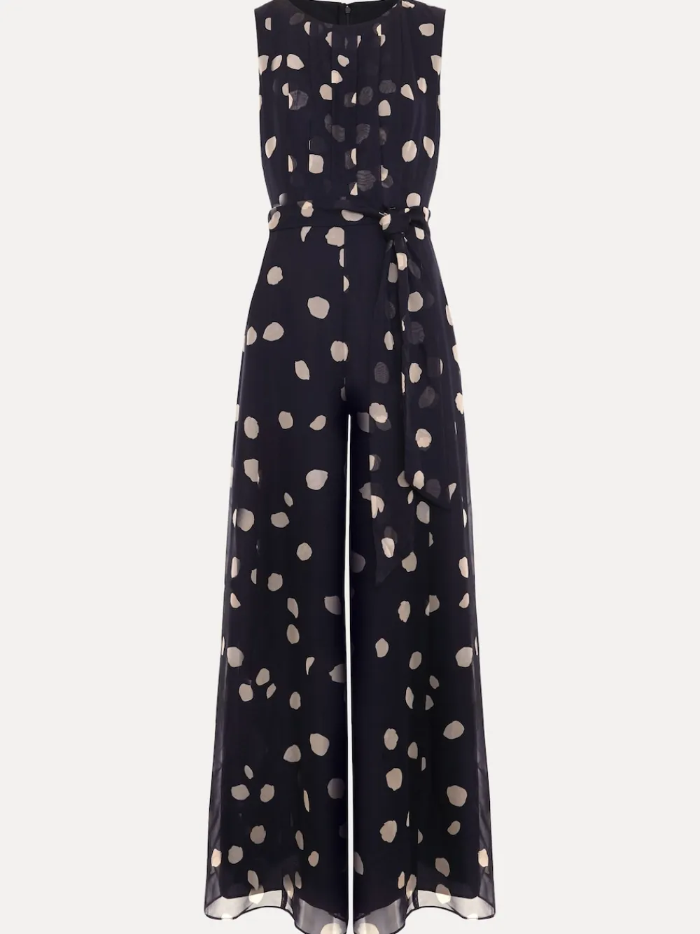 Polka dots are always on trend. Our bestselling Maxine wide-leg jumpsuit is now available in this timeless navy shade. Guaranteed to be your event-style favourite. Key design details include: A beautiful chiffon overlay with a contemporary polka dot pattern Elegant pleating to the bodice and a matching tie belt to enhance the silhouette This style is the epitome of modern, feminine style Just add heels and a clutch to finish the look Machine washable. 100% Polyester.