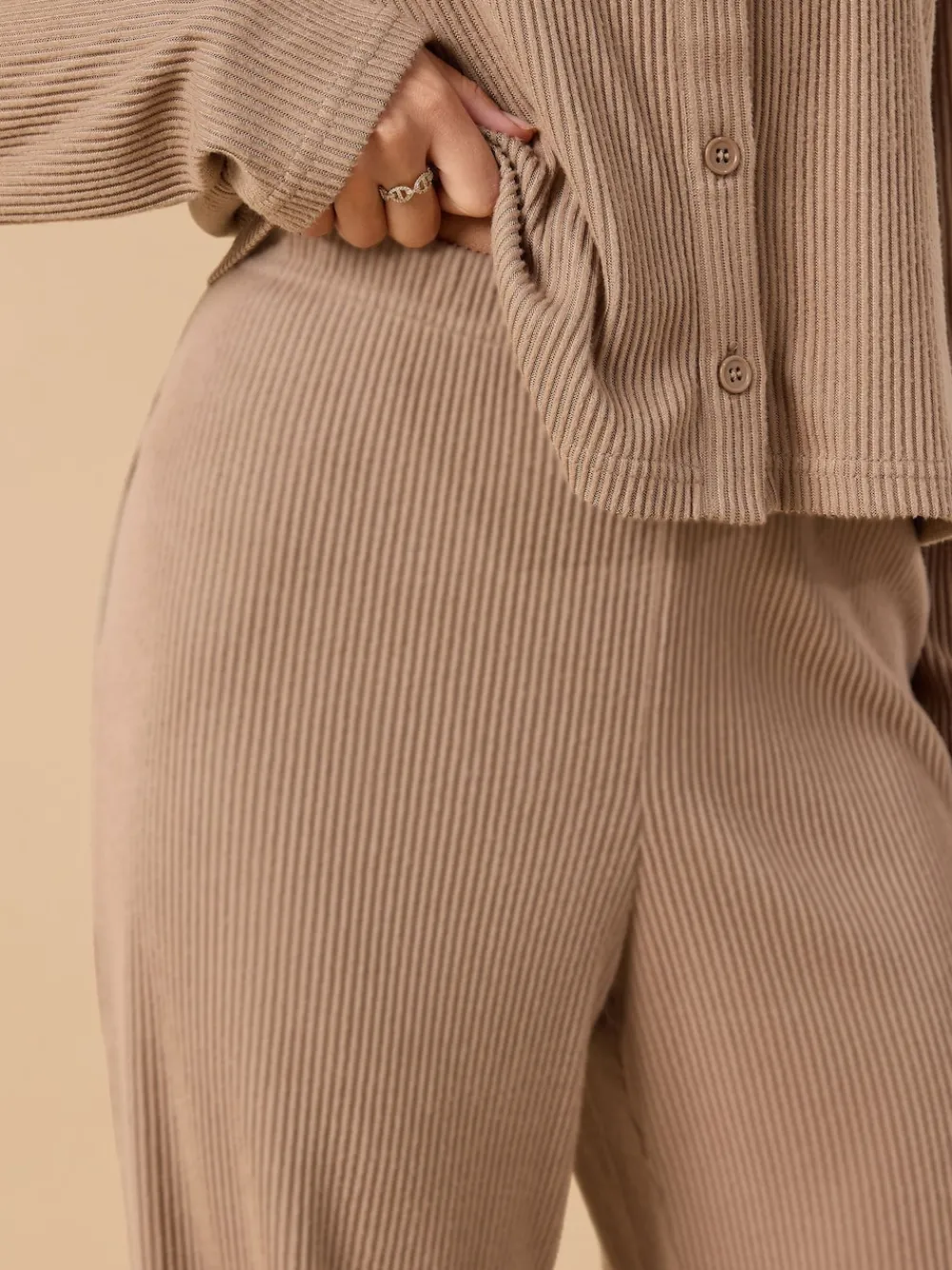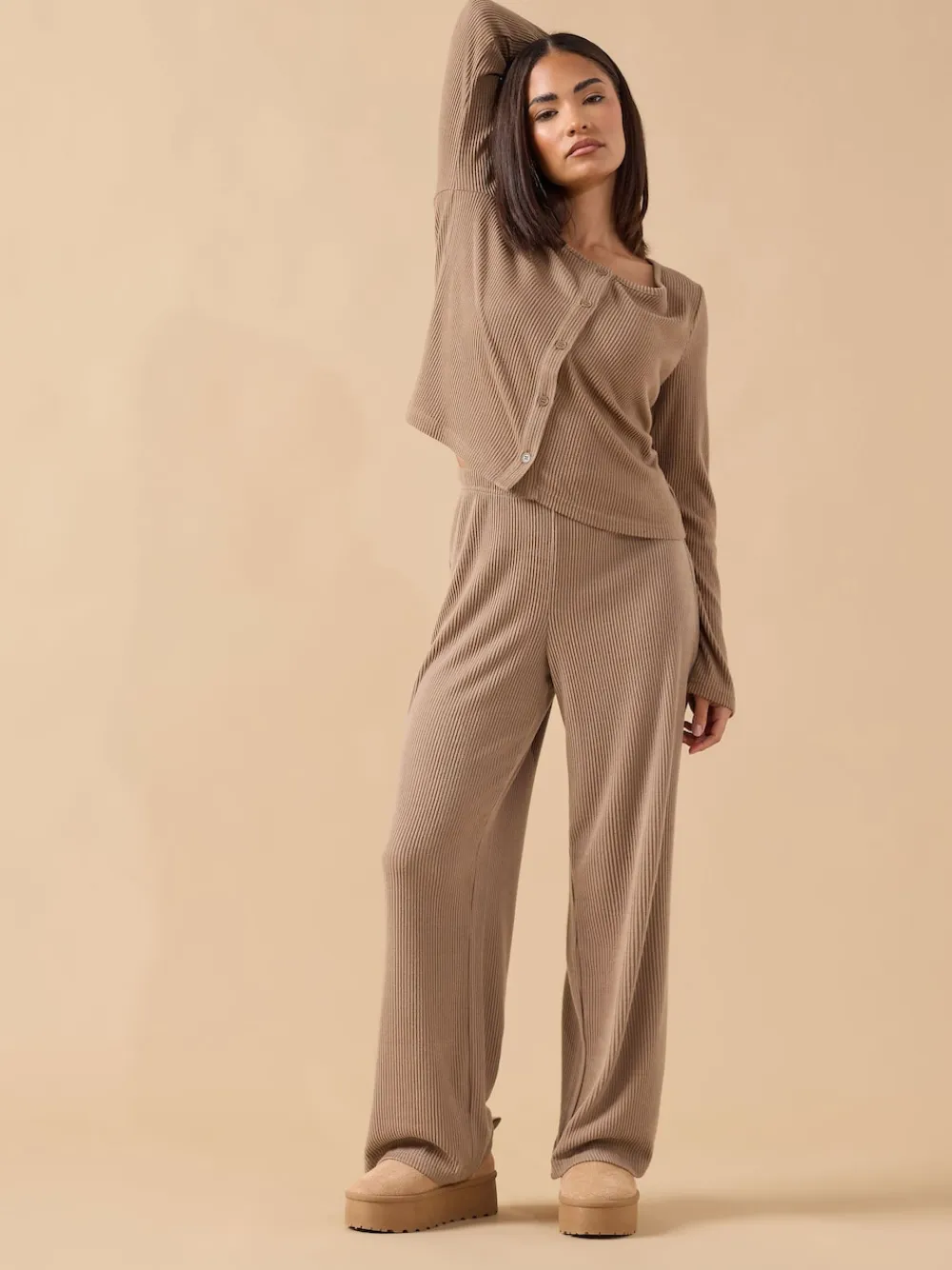 Fit & Fashion Notes: Achieve ultimate comfort on chill days with these trousers. Made from a ribbed jersey fabric, they feature a wide leg fit and an elasticated waistband. Pair with the matching ribbed cardigan for a cosy co-ord! Features: Ribbed texture Wide leg fit Elasticated waistband Made from a ribbed jersey fabric, polyester, elastane Inside seam measures: 27 Machine washable Model is 5’1”/ 155 cm and size UK 6 / EU 34. Machine washable. 95% Polyester, 5% Elastane.