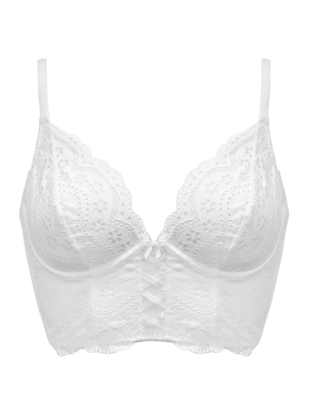 We’ve got a classy look, we know you’ll love. This White longline plunging bustier flatters and enhances your natural shape. With fully adjustable straps and soft broderie fabric, this feminine underwired and non-padded style will soon become a lingerie favourite. Wear with underwear from the Swoon collection for a look of elegance from head to toe. Hand wash only. 63% Polyester, 26% Nylon, 11% Elastane.