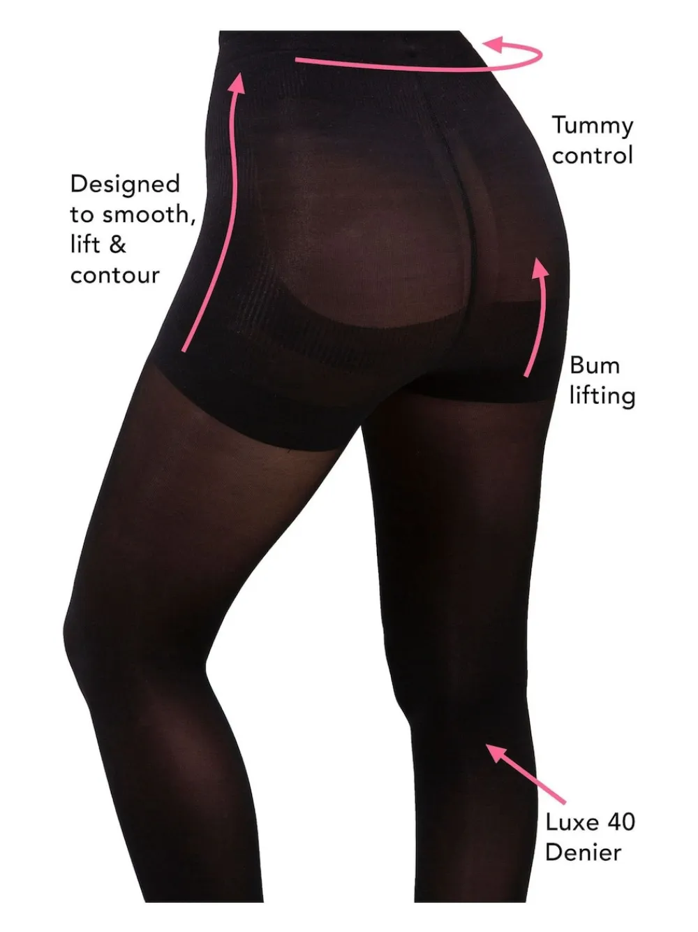 Designed to smooth, lift & contour. Features firming bum, hip, and tummy control that will also help to lift and shape in all the right places with a 40-denier leg from Pour Moi. Shaping control 40 Denier 88% Nylon, 12% Elastane. Warning: Keep away from fire and flames.