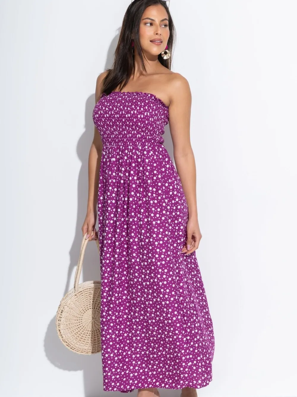 Indulge in beachside fashion with the Strapless Shirred Bodice Purple Spot Maxi Beach Dress. The shirred bandeau design ensures a secure and comfortable fit, giving you all the support, you need on your next getaway. Plus, it comes with fully adjustable and removable straps, giving you the freedom to customise your look to suit your style and comfort. In a timeless maxi length, this beachwear dress is the perfect choice for both casual beach strolls and transitioning seamlessly to a beachside bar. Machine washable. 100% Viscose.