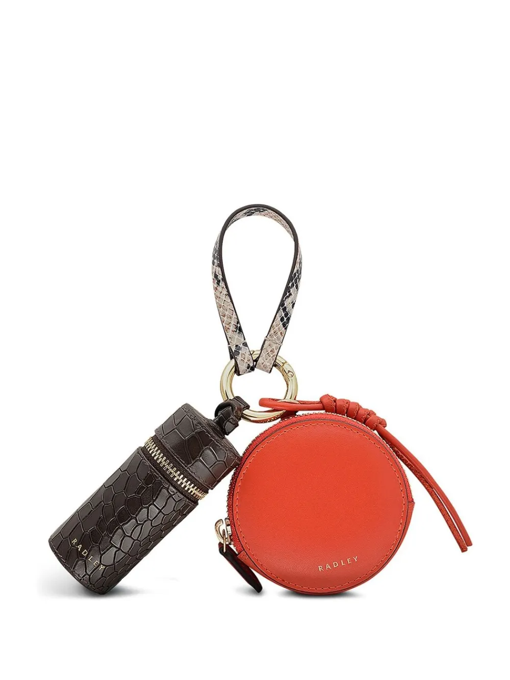 More than just a decoration, the Nicholas Road keyring features two zipped pouches perfect for storing those mini essential items – whether it’s keys, coins, or your favourite lipstick. Crafted with smooth leather, a knotted leather charm, and carabiner clip ring hardware. – Smooth leather – Padded, round zipped coin purse – Cylinder pouch with zipped lid – Knotted leather keyring – Chunky hardware loop with carabiner clip. Main 100% Leather. Lining 100% Mixed fibres.