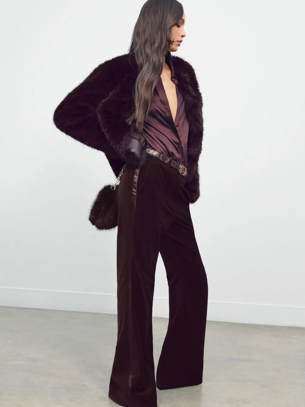 The Burgundy Elia trousers are crafted from plush velvet for a luxurious evening-ready feel. A flared silhouette is elevated by tuxedo-style satin side stripes, combining sleek tailoring with subtle statement detail. Velvet Flared leg Satin side stripe Angled side pockets Hook-and-bar with zip The model is wearing a size 8. Measurements of model: Height 5ft 9” / 175cm. Dry clean only. 100% Cotton.