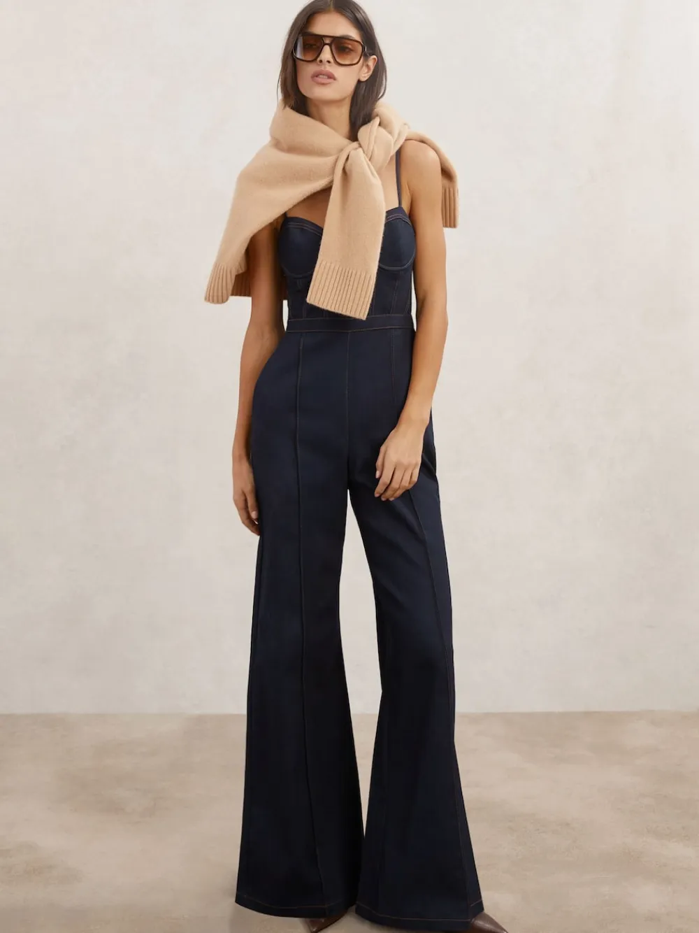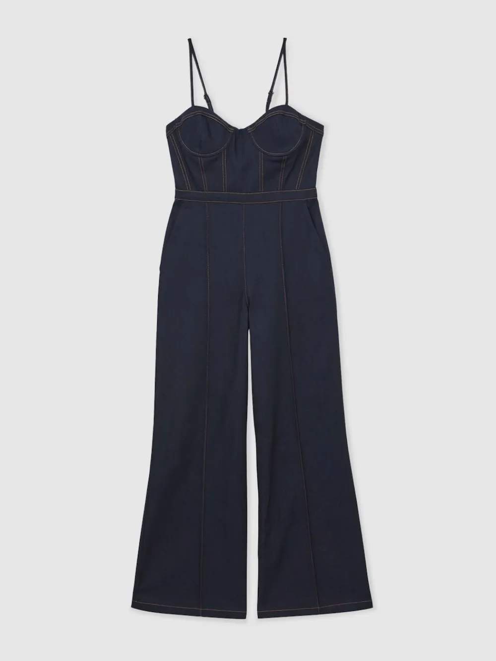 Crafted from denim with a hint of stretch, the Macey jumpsuit features a fitted bodice that flows into a wide-leg silhouette. Boning through the bodice provides structure and support, while contrast topstitching adds a modern edge to this statement piece.Cotton denim with stretchWide legBoned bodiceContrast topstitchingAdjustable shoulder strapsConcealed zip to reverse Regular inside leg length 32″ / 81cm. Machine washable. 98% Cotton, 2% Elastane.